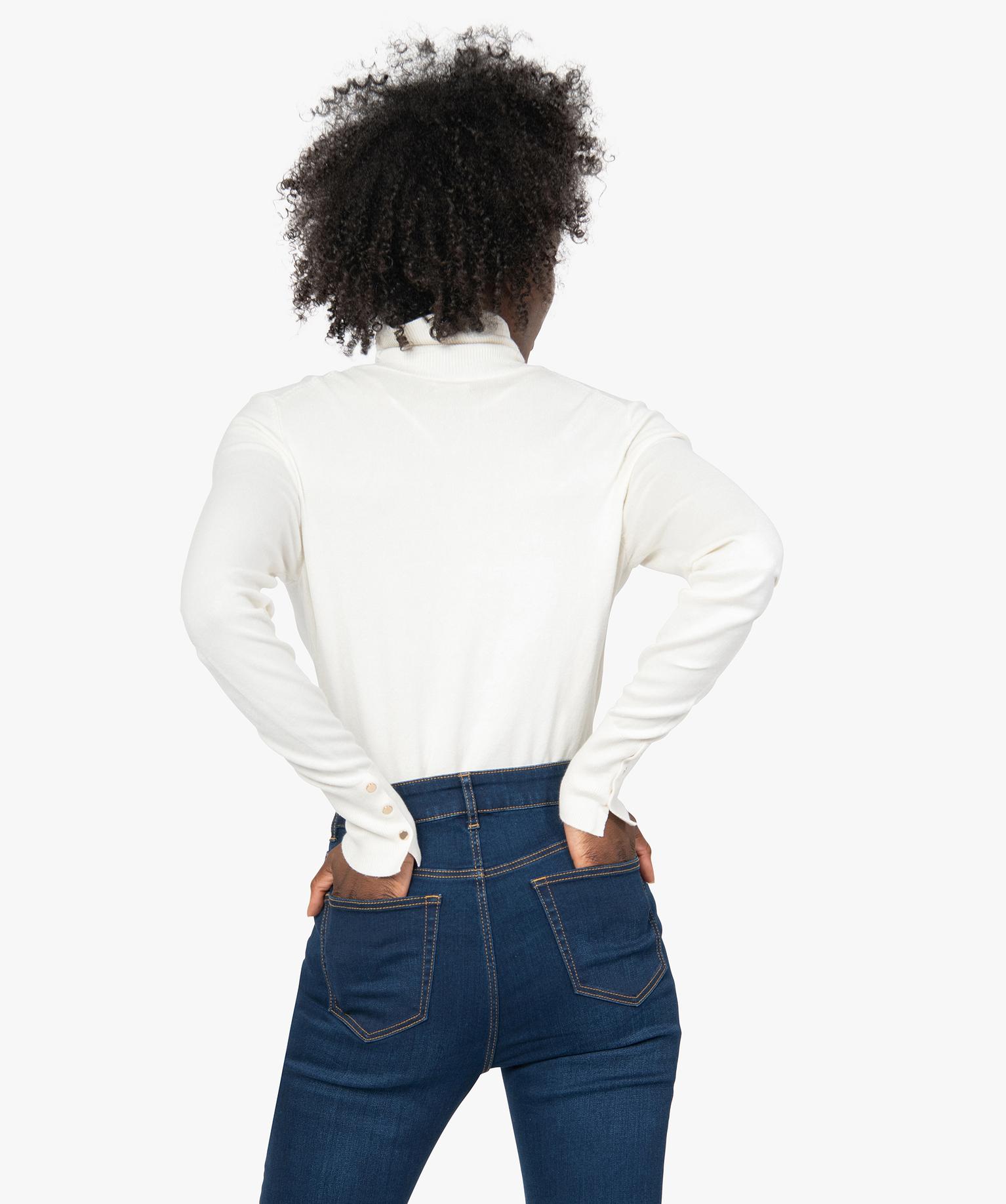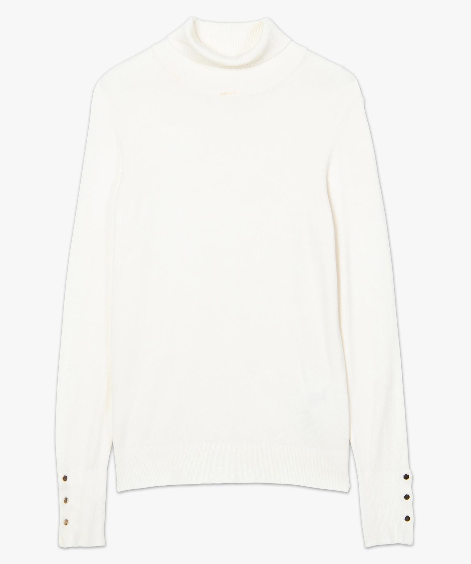 Incontournable du dressing, le pull col roulé se distingue cette saison par ses petits boutons métalliques au niveau des poignets, une discrète touche d’élégance qui fait toute la différence ! Ce pull femme, confectionné dans une maille fine, est facile à porter seul ou sous une veste de tailleur. Il accompagne volontiers une jupe ou un pantalon en toile pour une allure chic, ou bien un jean pour un style plus décontracté. Ce pull uni possède des finitions en fin bord-côte dans le bas, aux poignets et au niveau du col.