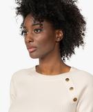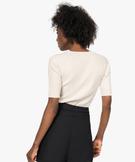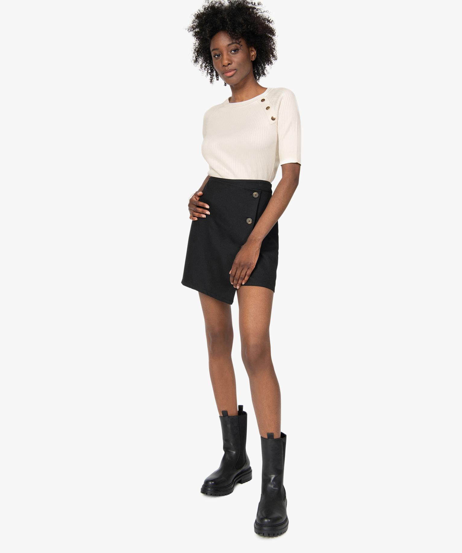 Un pull femme particulièrement élégant avec ses manches courtes et ses boutons fantaisie sur l’une des emmanchures. Un pull qui met la silhouette en valeur grâce à sa maille côtelée et ses emmanchures raglan. Il possède un joli col rond et des finitions en fin bord-côte dans le bas et au bord des manches. Un pull à manches courtes parfait pour l’entrée de saison, qui se porte seul ou sous un blazer.