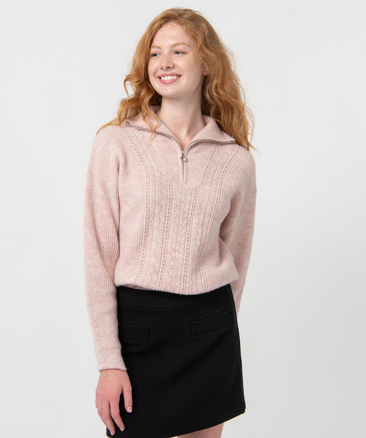 Ce très joli pull pour femme confectionné à partir de polyester recyclé, apporte une touche plus responsable dans le vestiaire féminin. Ultra doux, il est également bien chaud grâce à la laine et à l’alpaga qu’il contient. Ce pull en maille fantaisie sur l’avant du buste possède un grand col montant zippé avec boucle métallique sur le curseur. Un pull à col camionneur décliné dans des teintes pastel, parfaites pour adoucir un jean brut.