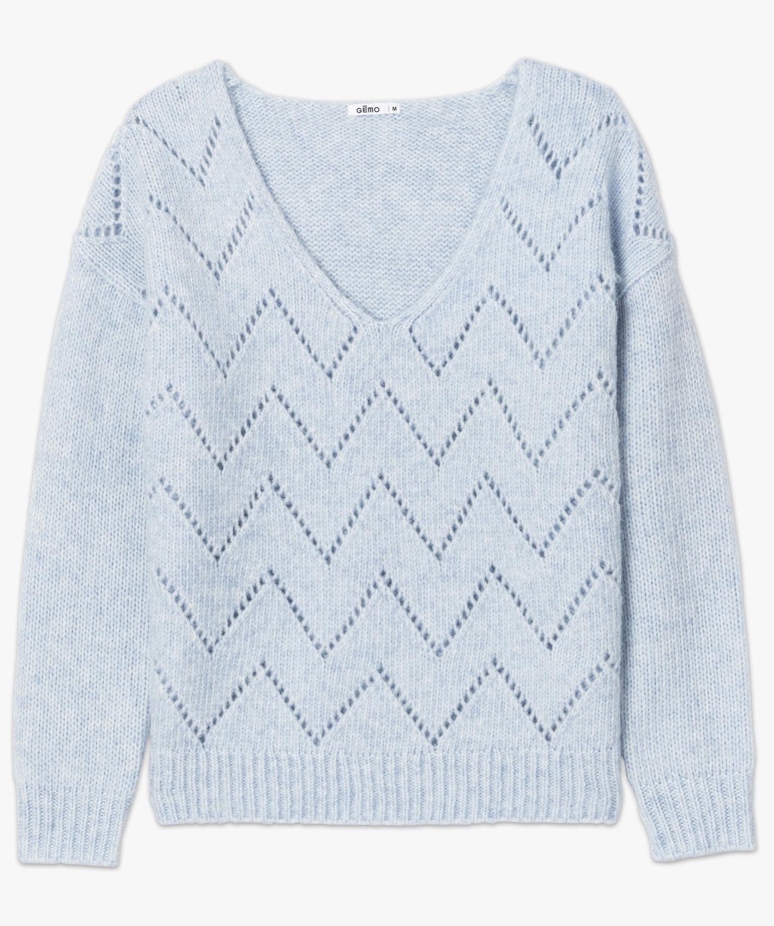 Pull femme en maille fantaisie avec grand col V bleu chine