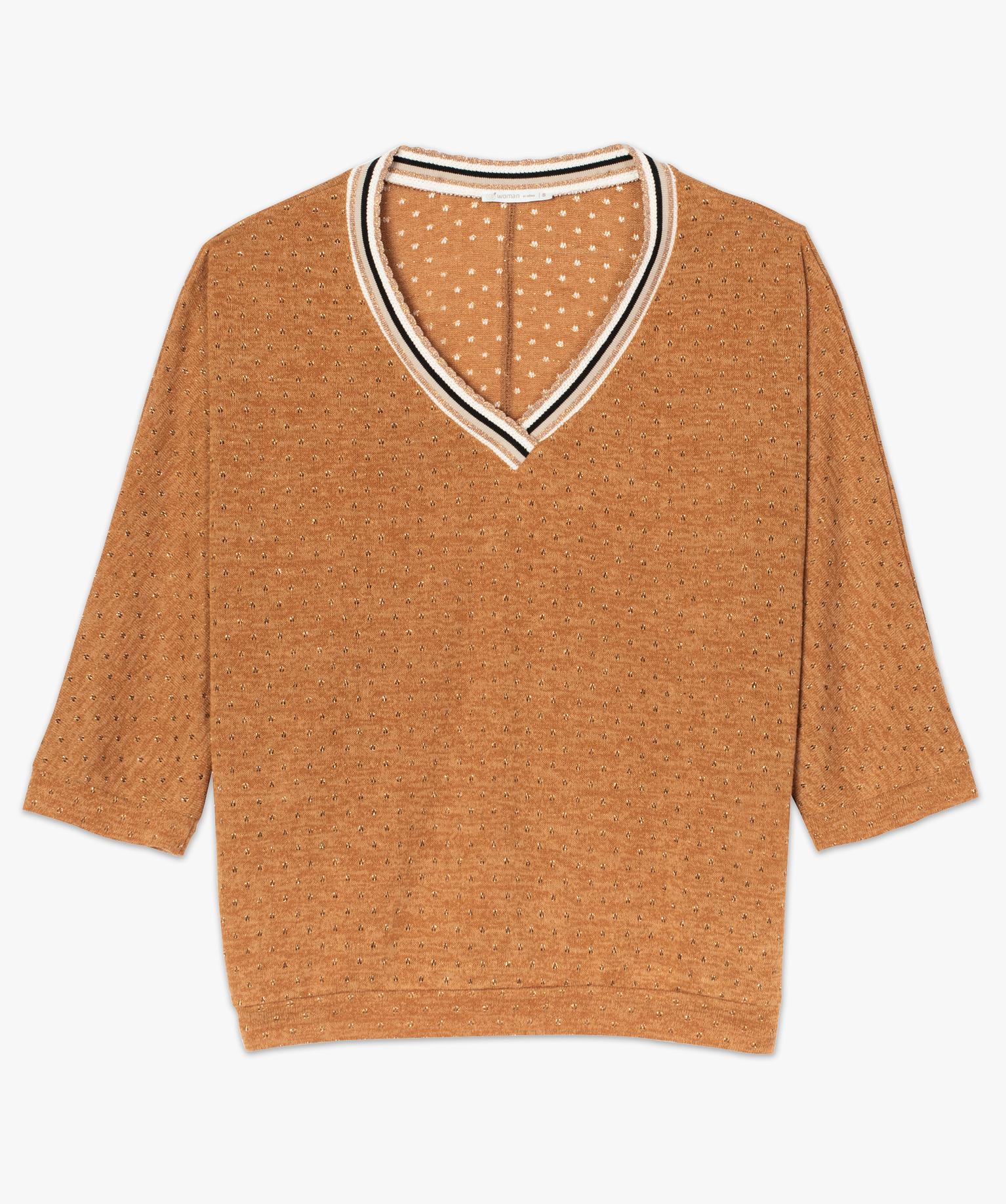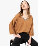 On aime ce top, entre le tee-shirt et le pull. Une belle pièce, en maille légère, au look décontracté avec ses manches chauve-souris. Ce pull femme est ajouré et souligné de fils de lurex pour une note de brillance raffinée. Le pull fin possède des manches 3/4, un grand col V avec large finition à rayures multicolores parsemé de paillettes. Le bas du pull est terminé par une bande légèrement resserrée, pour un effet blousant. Un pull pailleté idéal avec un jean slim et des ballerines.