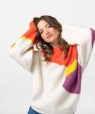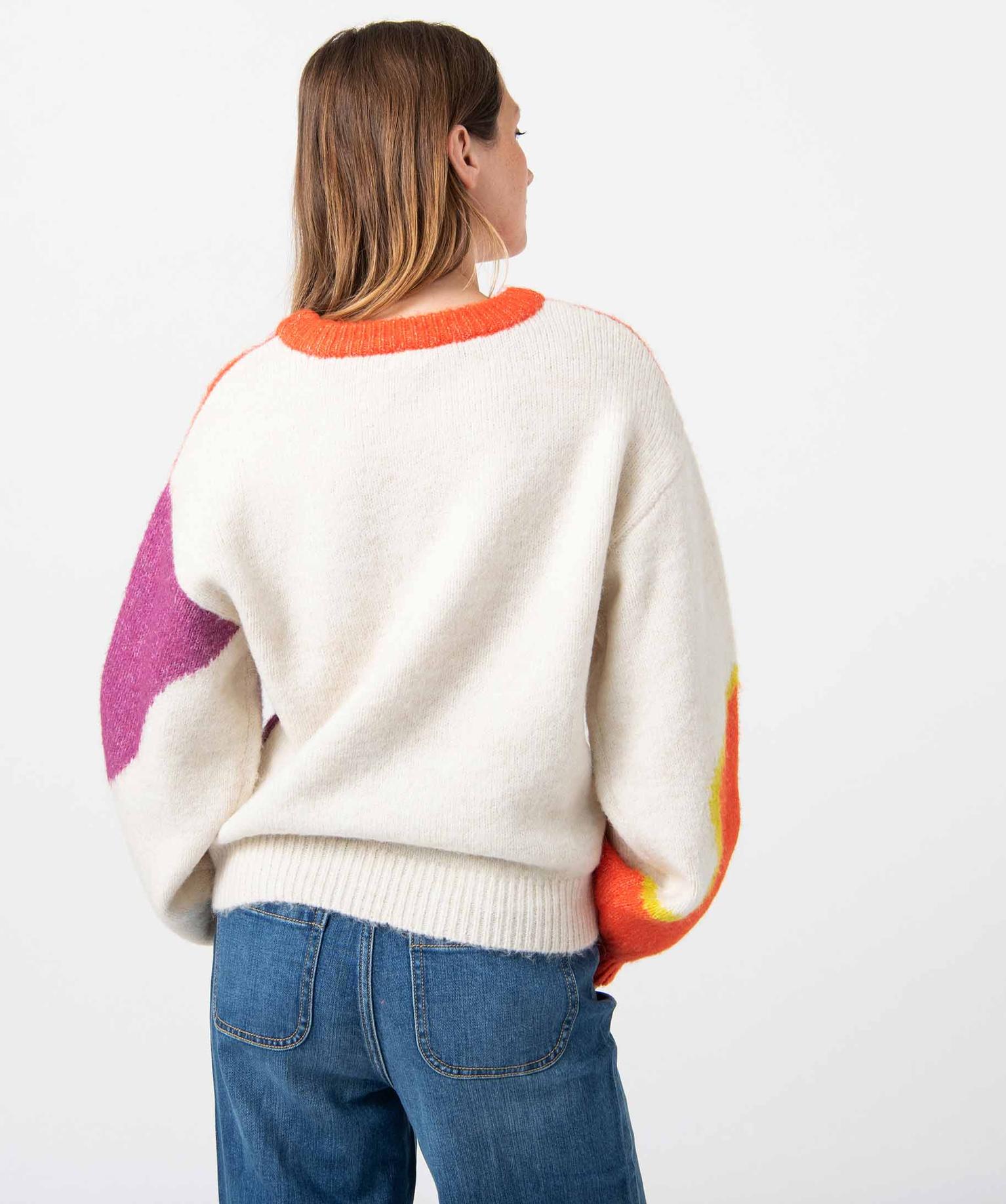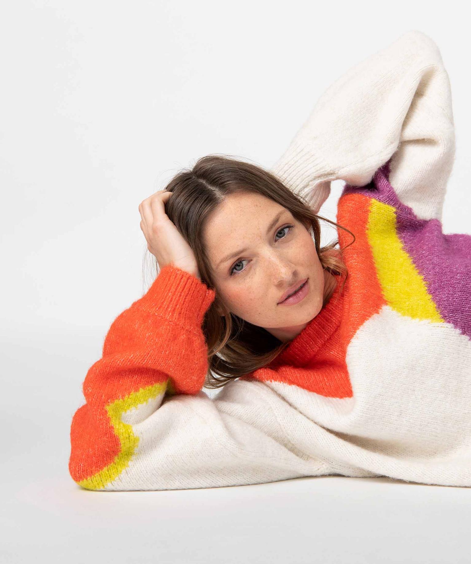 Un pull chaud et coloré confectionné à partir de polyester recyclé, vous allez adorer ! Ce pull pour femme tricoté dans une grosse maille offre un grand confort grâce à sa coupe ample, ses manches larges avec emmanchures descendues et son col rond. Un pull multicolore qui apportera une touche éco-responsable dans le dressing. On le porte avec un jean slim et une paire de boots pour s’assurer un style unique. Finitions bord-côte.