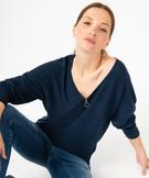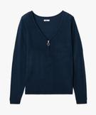 Pull fin à col V zippé manches chauve-souris femme bleu