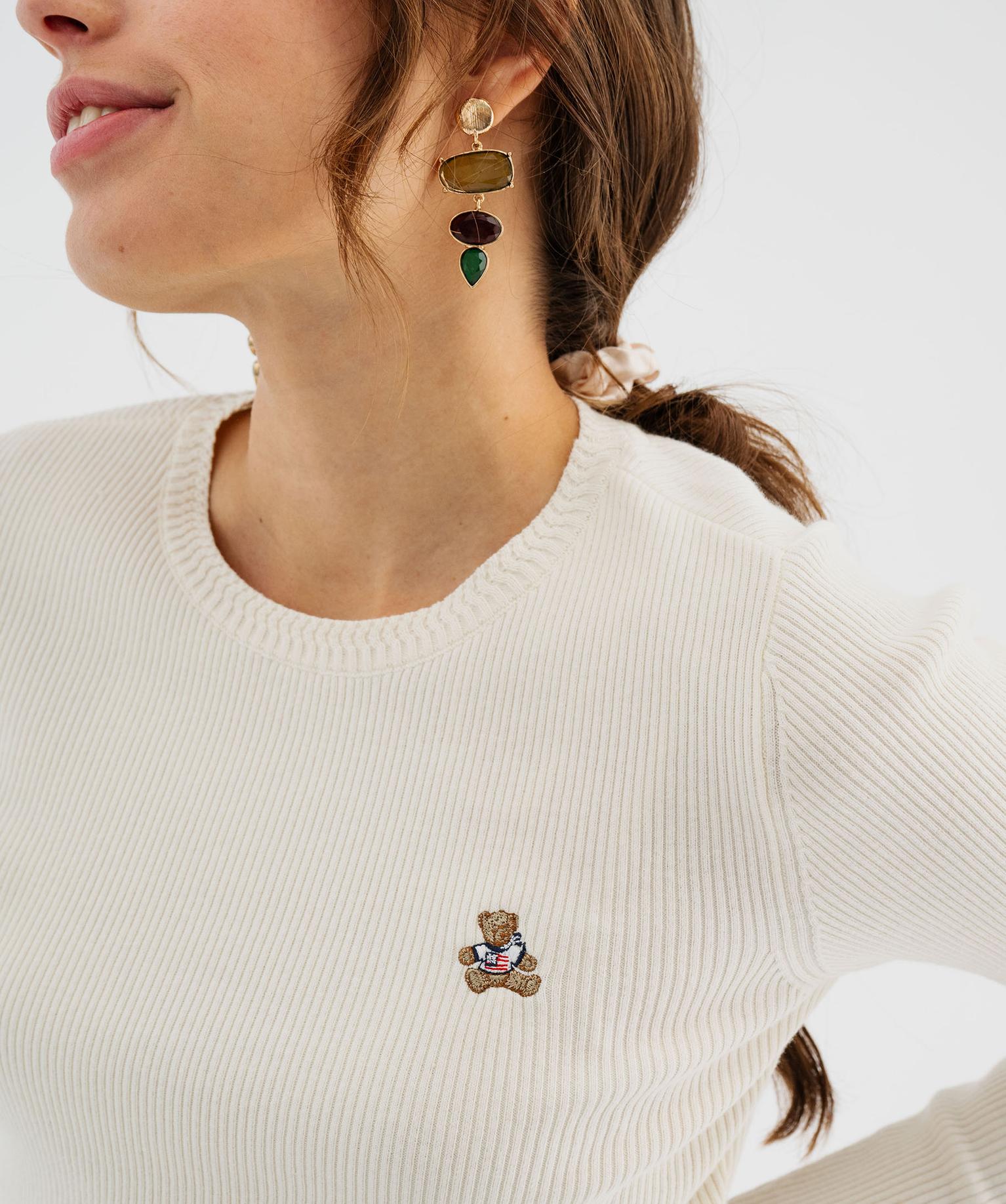 À porter seule, sous vos robes chasubles ou vos salopettes, ce pull chaussette est un indispensable. Signé LuluCastagnette, le pull femme est fabriqué dans une maille fine côtelée, avec une coupe ajustée très confortable. Il présente un col rond à la maille fantaisie, des manches longues, une finition sobre et pour le clin d'œil à la marque, un adorable ourson brodé sur la poitrine.