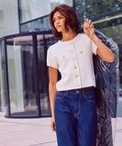 Difficile de résister au charme chic et à l'esprit couture de ce pull femme ! Tricoté dans une maille fantaisie texturée, le pull manches courtes est orné de gros boutons gravés et dorés, à la façon d'un cardigan. Sur la poitrine deux fausses poches apportent du relief à l'ensemble. Le pull présente une finition côtelée au bas des manches, à la base, à l'encolure et au niveau de la boutonnière factice. Son encolure ronde souligne élégamment le port de tête. Sa coupe droite et courte magnifie un jean flare ou un pantalon ample.