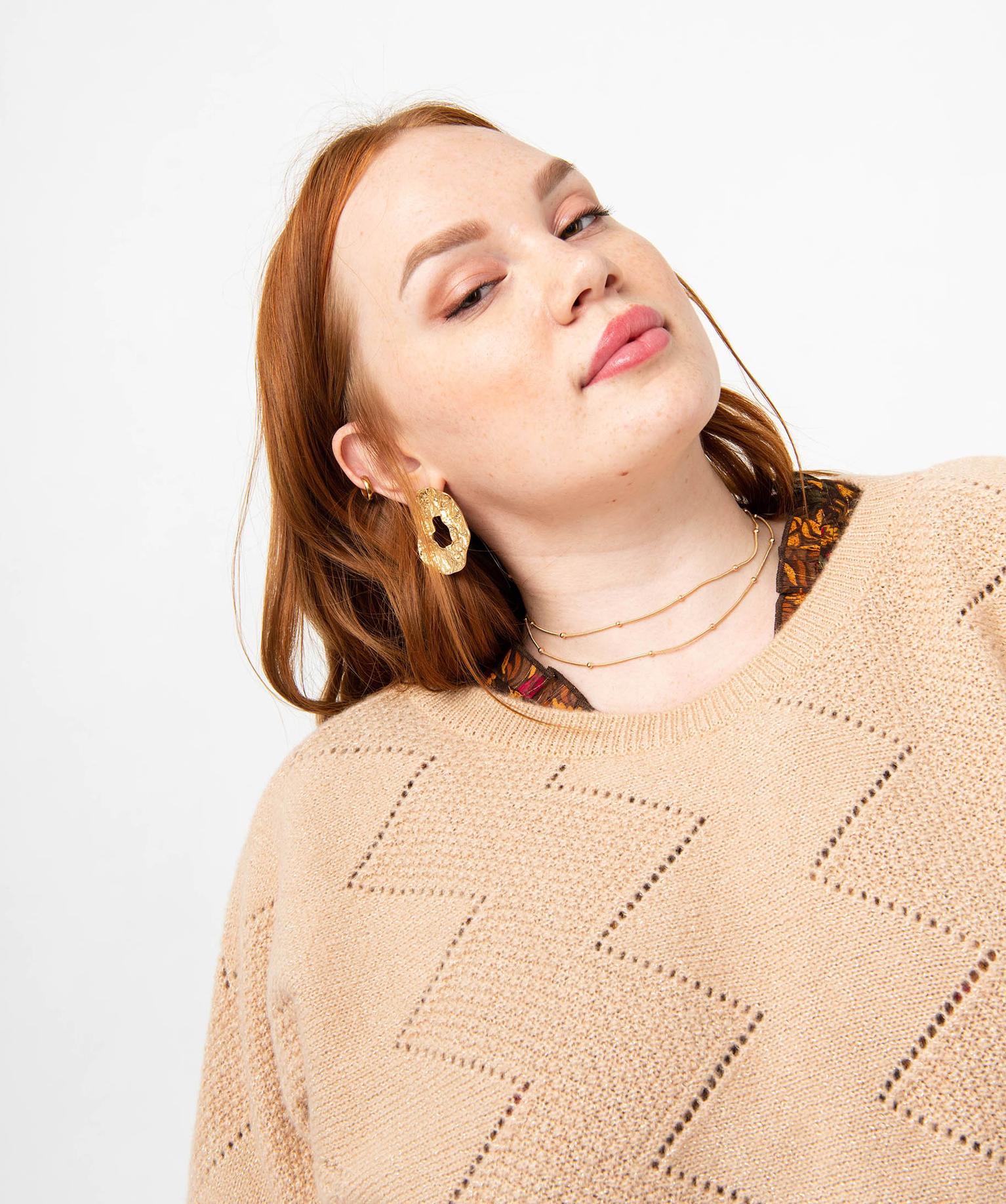 Un pull femme grande taille (du 46/48 au 54/56) aussi élégant que confortable dans lequel vous allez adorer vous blottir. Confectionné dans une maille douce incrusté de fil pailleté, il se distingue par une maille fantaisie affichant des motifs zigzag et des emmanchures chauve-souris. Ce pull ample sublime le port de tête grâce à un large col rond. Il possède des finitions bord-côte aux poignets et une bande non resserrée dans le bas. Jouez les contrastes en portant ce pull ajouré avec un jean slim et une paire de bottes.