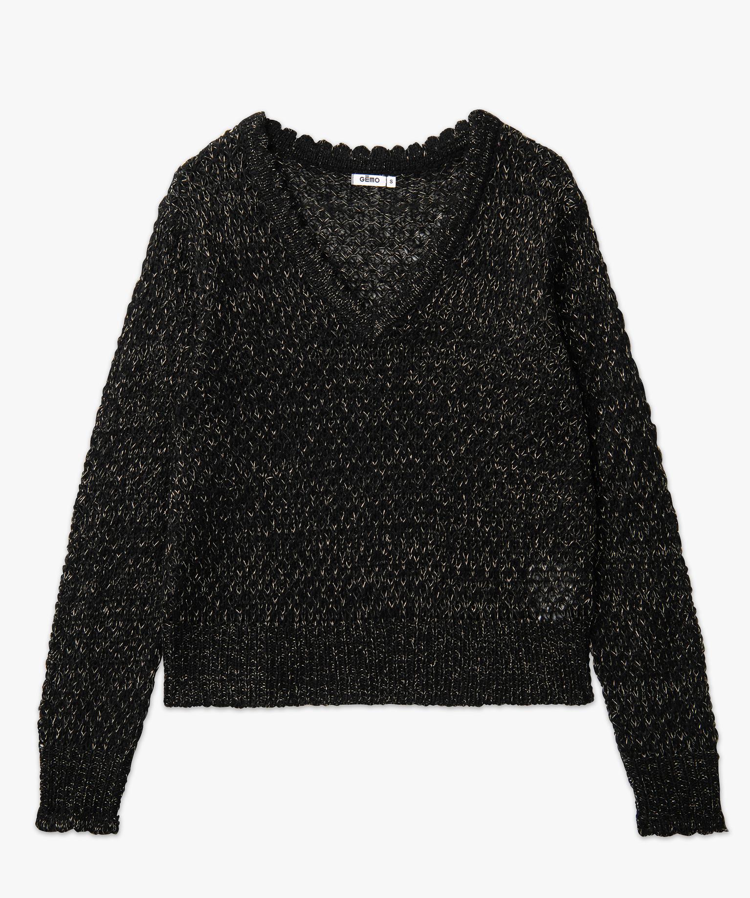 Ce joli pull femme permettra d’illuminer l’ensemble de votre dressing et d’apporter un esprit festif à vos tenues. Ce pull col V en maille ajourée est incrusté de fil métallisé et doté de jolies finitions dentelées qui lui confèrent une allure glamour et féminine. Un pull pailleté à porter en soirée et pour les grandes occasions avec une jupe droite et des escarpins à talon ou bien avec un jean enduit et des boots vernis crantés pour une allure glam’rock.