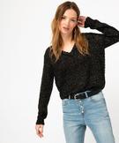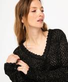 Ce joli pull femme permettra d’illuminer l’ensemble de votre dressing et d’apporter un esprit festif à vos tenues. Ce pull col V en maille ajourée est incrusté de fil métallisé et doté de jolies finitions dentelées qui lui confèrent une allure glamour et féminine. Un pull pailleté à porter en soirée et pour les grandes occasions avec une jupe droite et des escarpins à talon ou bien avec un jean enduit et des boots vernis crantés pour une allure glam’rock.