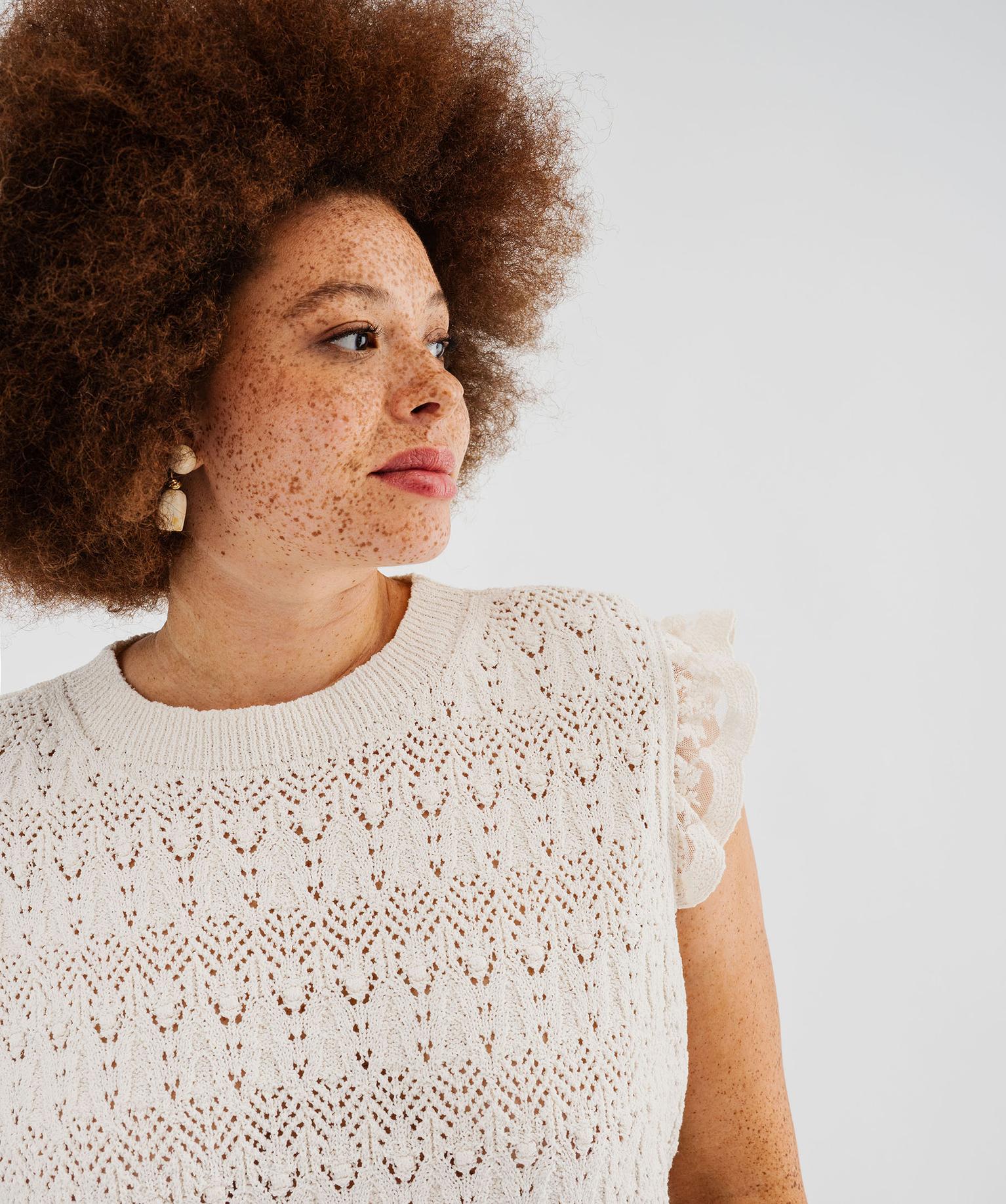 Léger et raffiné, ce pull sans manches est le parfait allié des journées ensoleillées. Confectionné dans une maille ajourée fantaisie façon crochet, le pull femme grande taille offre une jolie transparence. Ses épaules sont sublimées par une délicate dentelle au charme rétro, pour un look féminin et tendance. Son col rond et sa coupe droite offrent un confort absolu. À porter seul ou sur sur des manches longues ajustées, le pull d'été rehausse instantanément votre tenue.