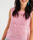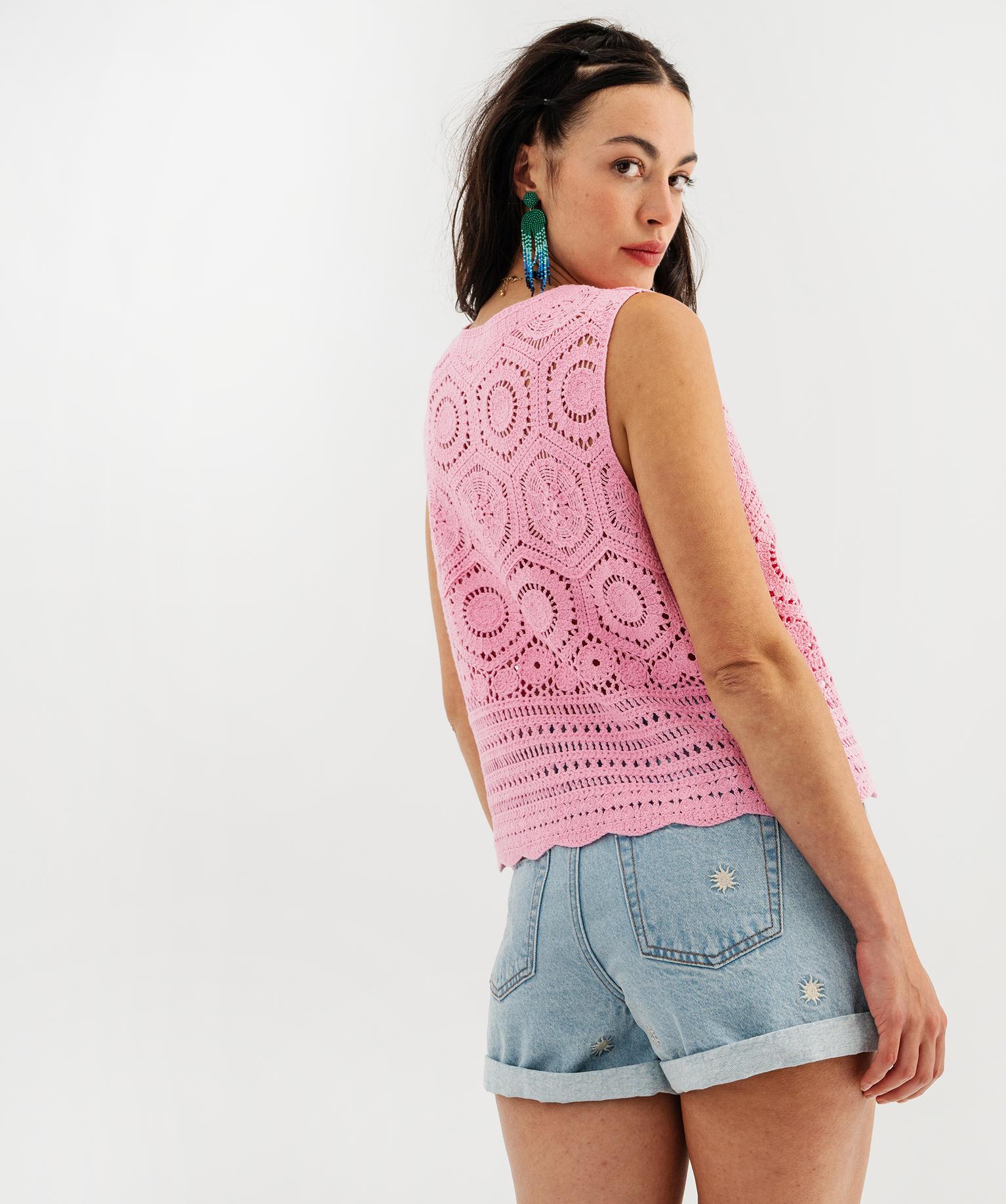 Ce pull femme sans manches en maille ajourée séduit par son style bohème chic et sa légèreté idéale pour les beaux jours. Inspiré du crochet granny, le pull d'été présente une coupe droite légèrement large, décontractée mais élégante, avec une encolure ronde dégagée qui met en valeur le port de tête. La finition festonnée en bas du pull apporte une touche délicate et féminine. Disponible dans des couleurs estivales lumineuses, ce pull sans manches se porte facilement avec un short, une jupe ou un pantalon léger pour un look estival et raffiné.