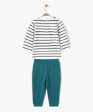 Bébé sera parfaitement à son aise et bien au chaud avec ce pyjama 2 pièces ! Formé d'un haut à manches longues et d'un bas avec taille élastiqué, ce pyjama bébé est pratique pour changer bébé rapidement et le laisser acquérir petit à petit de l'autonomie dans l'habillage et la propreté. Le bas uni et le haut rayé et imprimé forment un chouette ensemble dépareillé, pile dans la tendance mix&match. Vous serez séduit par sa matière molleton confortable, hyper douce à l'intérieure. Haut avec finition bord-côte uni extra fin au col et aux poignets. 3 boutons-pression dans le dos pour élargir l'encolure et simplifier l'habillage. Bas avec finition bord-côte extra fin aux chevilles et à la taille.