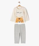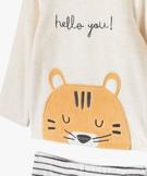 Pyjama bébé composé de 2 pièces en velours hyper douillettes : un haut à manches longues et col rond et un bas coupe droite à taille élastique. Le haut de pyjama est décoré d'une tête de félin et d'une inscription brodée. Il s'enfile aisément grâce à des boutons-pression dans le haut du dos. Le bas de pyjama est entièrement rayé, pour un sympathique effet mix&match.