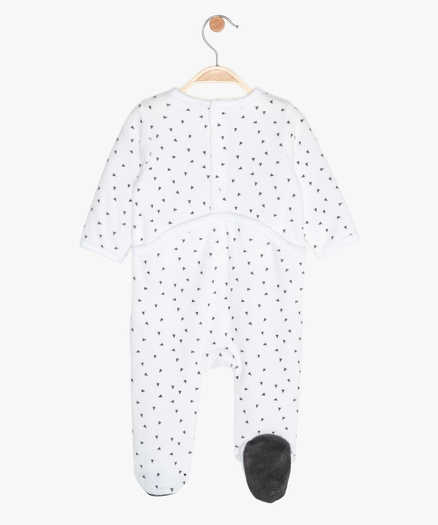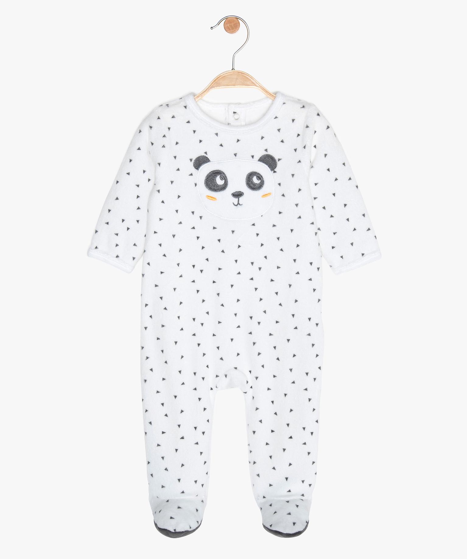 Les amoureux des pandas vont adorer ce dors-bien pour bébé. Le pyjama est en effet décoré d'une grande tête de panda douce, brodée sur la poitrine, et parsemé de petits motifs géométriques en contraste. Le pyjama bébé est confectionné dans un velours chaud et doux, idéal pour la saison. Il est équipé d'un pont-dos pressionné pour faciliter le change et l'habillage.