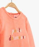 - un haut de pyjama à manches longues et col rond, fabriqué dans un velours à la couleur gourmande et brodé "petite dormeuse" devant. Le dos possède 3 boutons-pression pour faciliter l'habillage ;