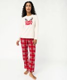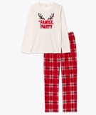 Haut de pyjama coupe droite, manches longues, col rond. Décoration de Noël en relief sur l'avant. Bas de pyjama à carreaux, coupe droite, taille élastiquée.