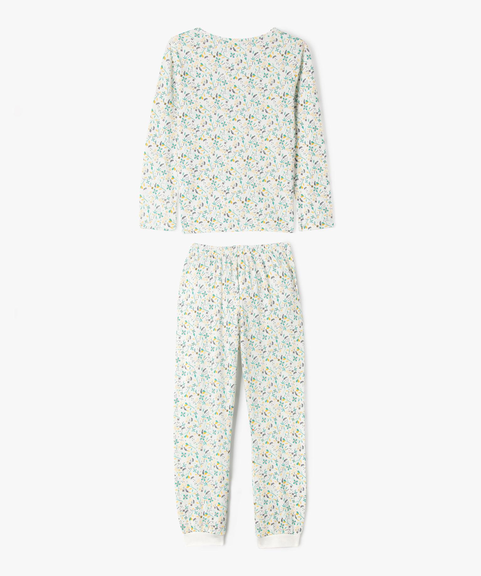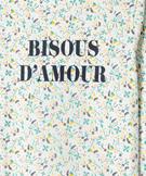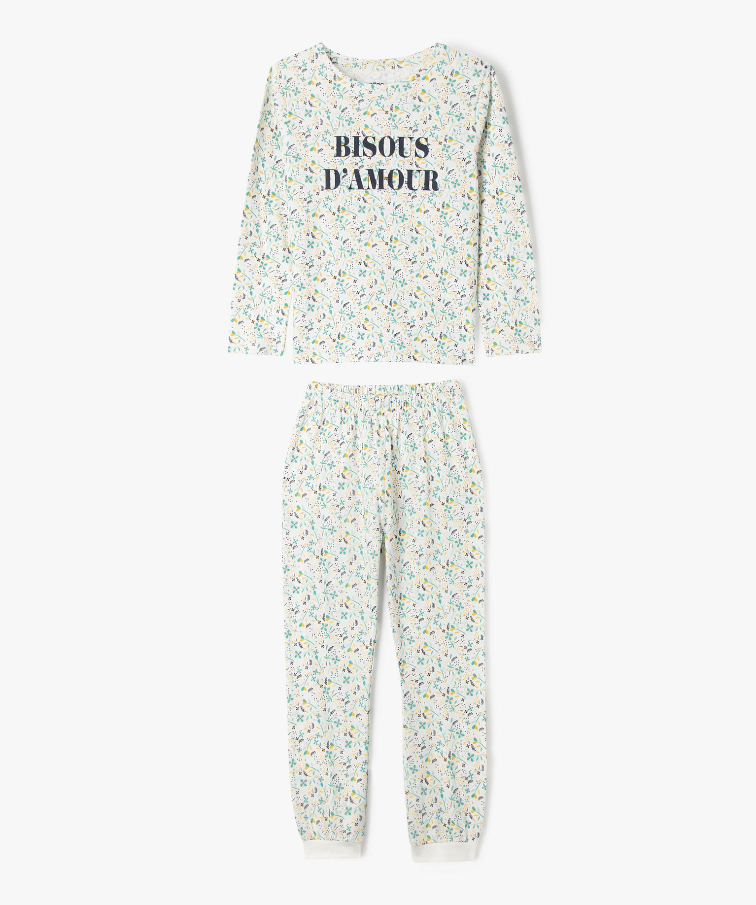 Ravissant pyjama fille. Un pyjama fabriqué en jersey de coton léger, idéal pour la mi-saison. Le pyjama 2 pièces se compose d'un haut manches longues et col rond avec inscription "Bisous d'amour" sur la poitrine et d'un pantalon de pyjama avec taille élastiquée et bas de jambe en bord-côte élastiqué. L'ensemble est entièrement parsemé d'un motif fleurs.