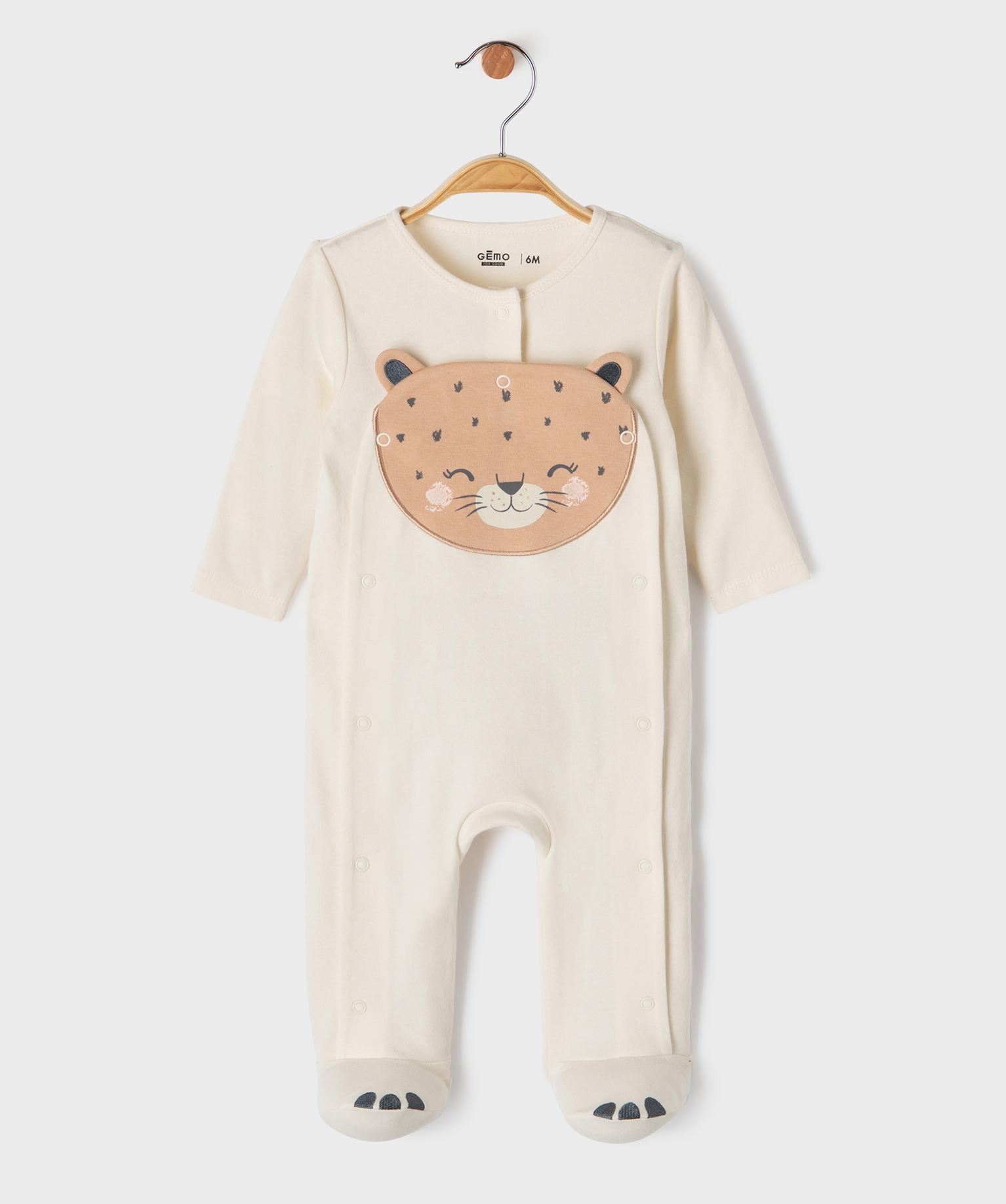 Pyjama en coton ouvert devant motif félin bébé fille ecru