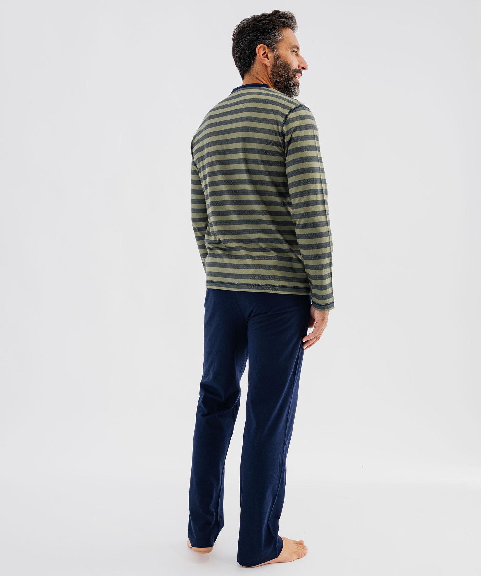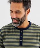 Ce pyjama homme 2 pièces allie simplicité et élégance pour vos nuits et vos soirées cocooning. Le bas de pyjama, uni et coupe droite, offre une taille élastiquée qui s’adapte à vos mouvements sans serrer. Le haut de pyjama, à manches longues, séduit par son col tunisien et ses rayures fantaisie qui apportent une touche graphique et moderne. Petit détail chic : les boutons écaille imitation qui complètent le style avec discrétion. 100% en jersey de coton doux, ce pyjama vous garantit un confort agréable nuit après nuit.