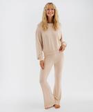 Conçu pour vos nuits paisibles comme pour vos moments de détente à la maison, ce pyjama femme en maille fluide et extensible associe style et bien-être sans compromis. Le haut à manches longues séduit par sa coupe loose dans l’air du temps, avec manches larges resserrées par un bord-côte et épaules tombantes. Il s'associe à un pantalon flare avec taille élastique conçu pour épouser vos mouvements en toute liberté. Un ensemble homewear doux, tendance et tellement agréable à porter… que vous ne voudrez plus le quitter !