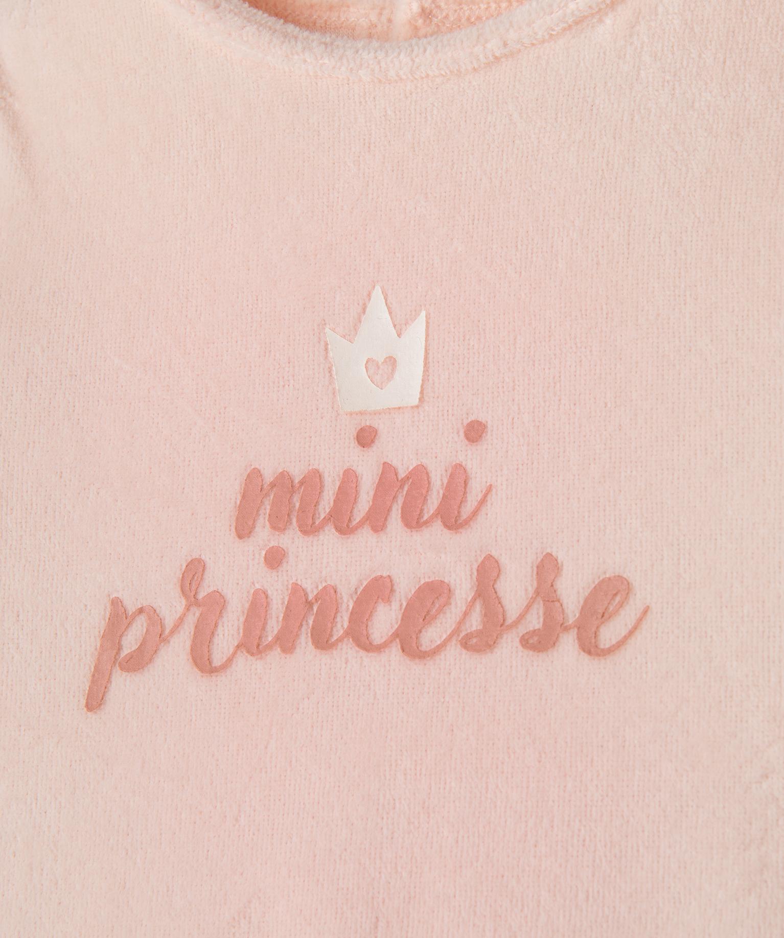 Cet joli pyjama bébé fille séduit par ses couleurs pastel et son inscription "mini princesse" sur le buste. Le pyjama en velours est douillet et bien chaud. Il s'enfile aisément et offre un change pratique grâce à sa fermeture pont-dos par boutons-pression,. Col rond.