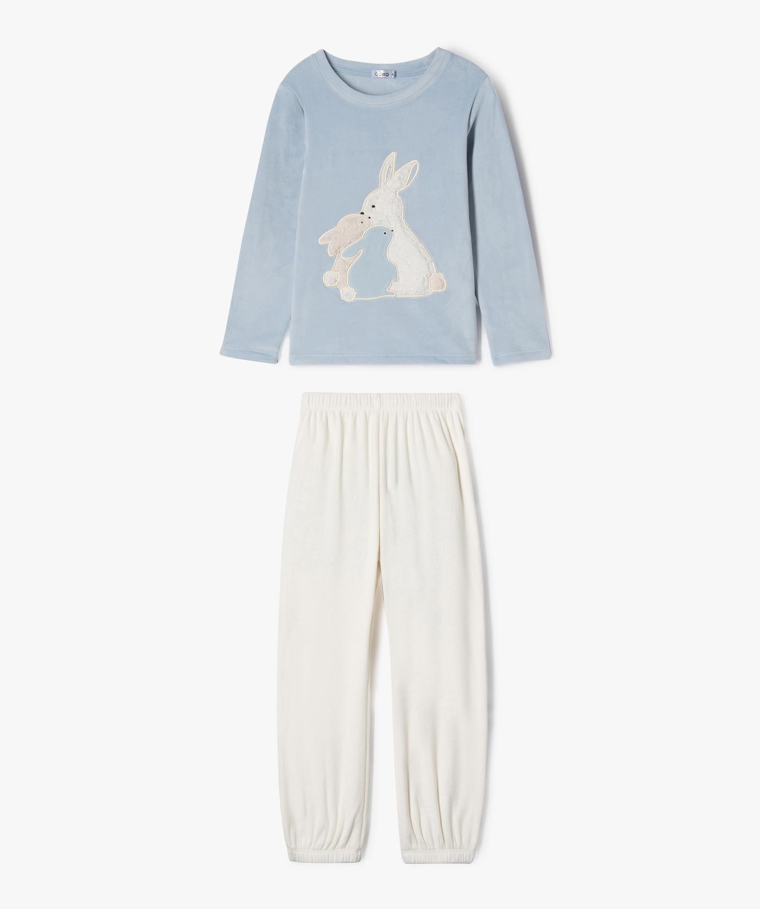 Les petites princesses vont succomber à la douceur de ce pyjama en velours aussi doux à l’intérieur qu’à l’extérieur. Un pyjama fille composé d’un haut à manches longues orné d’adorables petits lapins en maille peluche et d’un pantalon resserré aux chevilles. Un ensemble de nuit ultra confortable que les filles porteront aussi le jour lors des moments de détente. Bas uni. Col rond.
