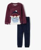Ce pyjama en velours ravira les adeptes de confort et de douceur. Mais ce n’est pas tout, il séduira également les enfants par son large motif monstre sur le haut, un adorable motif brodé en maille peluche. Ce pyjama garçon se compose d’un haut à manches longues avec col rond et d’un pantalon avec taille élastique, resserré aux chevilles. Un ensemble de nuit idéal pour passer des nuits douces et réconfortantes. Finitions bord-côte.