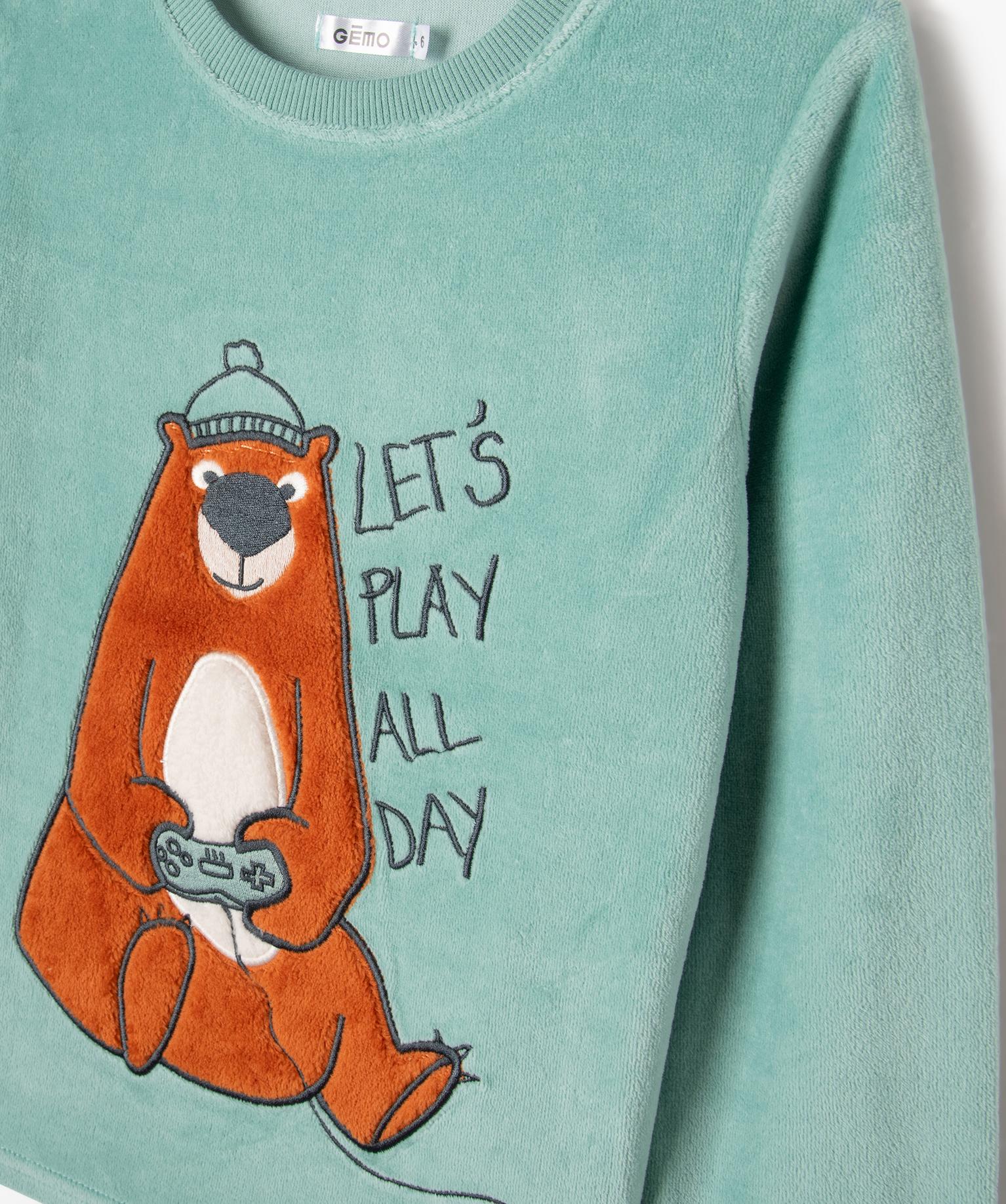 Ce pyjama en velours va ravir les amateurs de gaming ! Composé d’un haut à manches longues et d’un pantalon au coloris contrastant, il arbore un motif rigolo représentant un ours jouant aux jeux vidéo. Un pyjama garçon ultra confortable qui s’enfile facilement grâce à une ceinture élastique. Un pyjama aussi agréable à porter pour dormir que pour flâner les jours de farniente. Bas de jambes resserrés par un bord-côte.