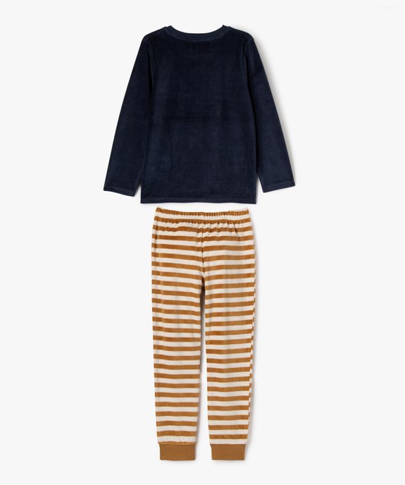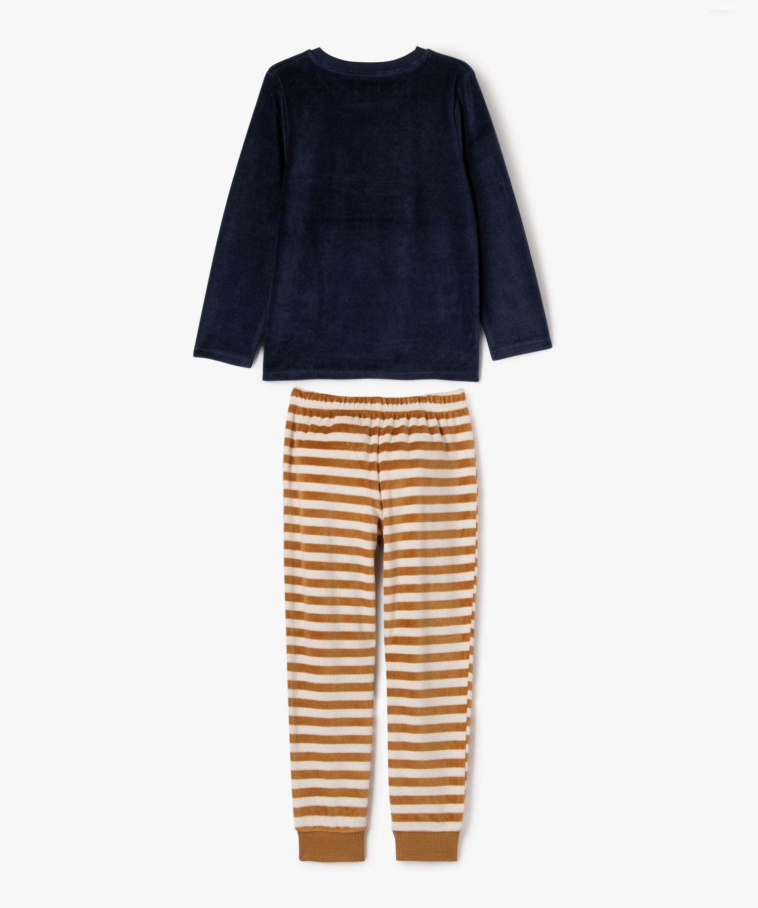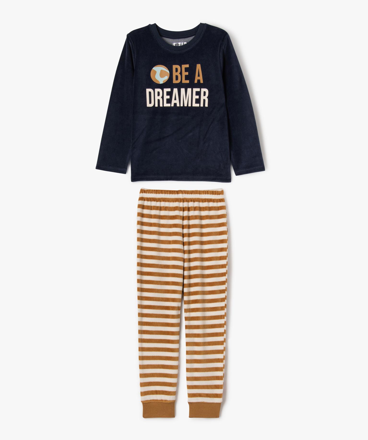 Le pyjama en velours remporte toujours tous les suffrages auprès des enfants. Ils apprécient le confort de sa matière et la douce chaleur qu’il procure. Ce pyjama garçon se compose d’un haut à manches longues orné d’une inscription et d’un pantalon rayé avec ceinture élastique. Une véritable invitation aux rêves pour des nuits paisibles.