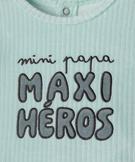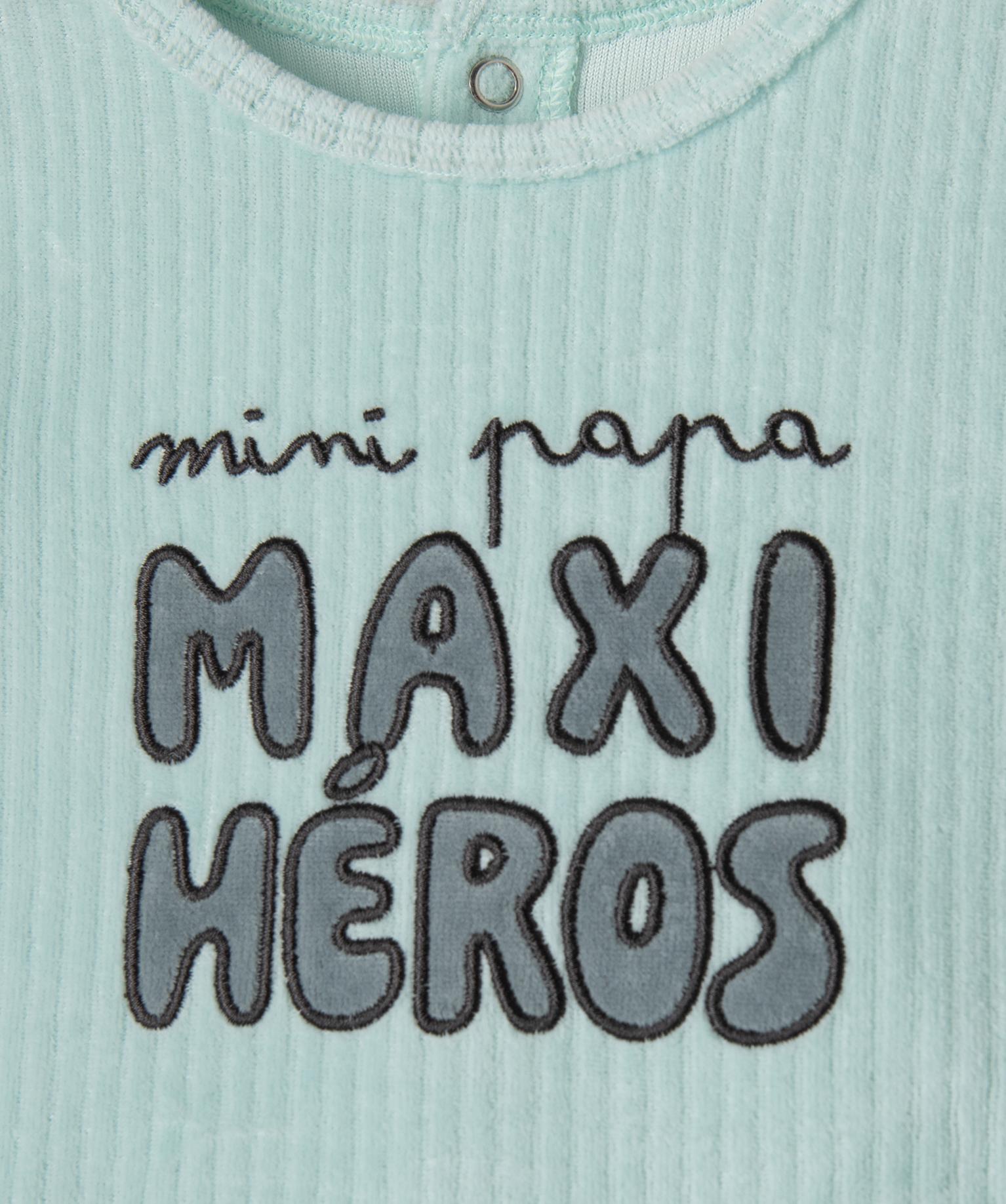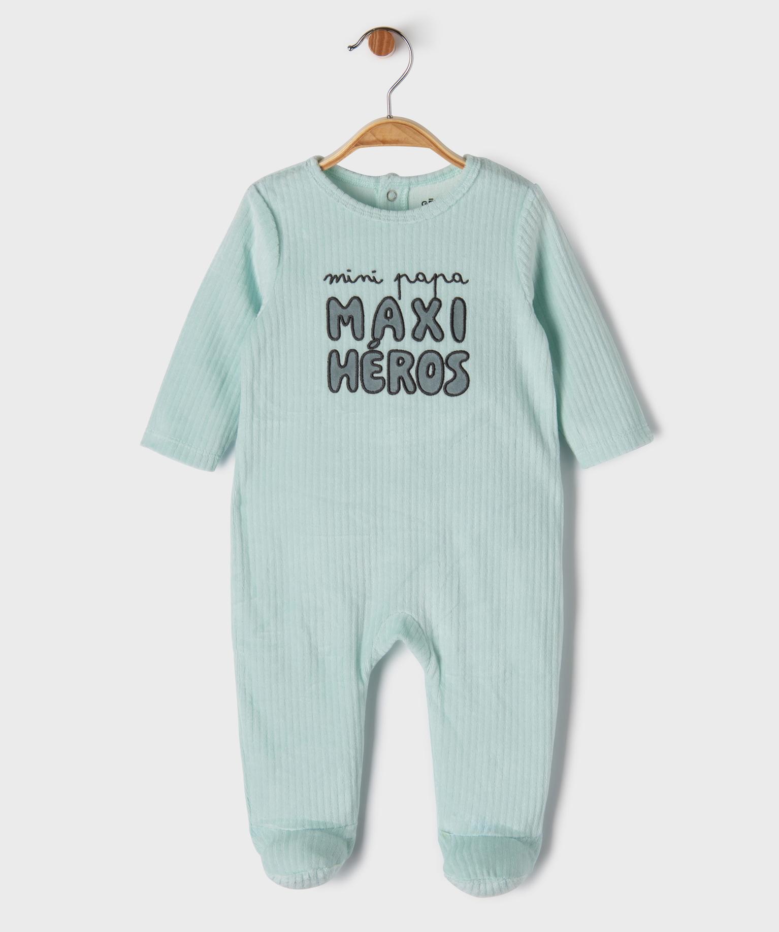 Ce pyjama en velours côtelé fin allie souplesse, douceur et fantaisie son adorable inscription. Il promet un confort idéal pour des nuits paisibles. Le pyjama bébé est décoré du message "mini papa, maxi héros" sur le buste. Doté d'une fermeture pont-dos à boutons-pression pratique, le dors-bien est facile à enfiler. Un choix parfait pour envelopper votre bébé dans un cocon de douceur en ajoutant une touche de couleur et d'humour fun dans son vestiaire homewear.