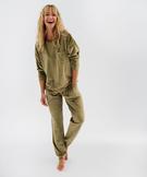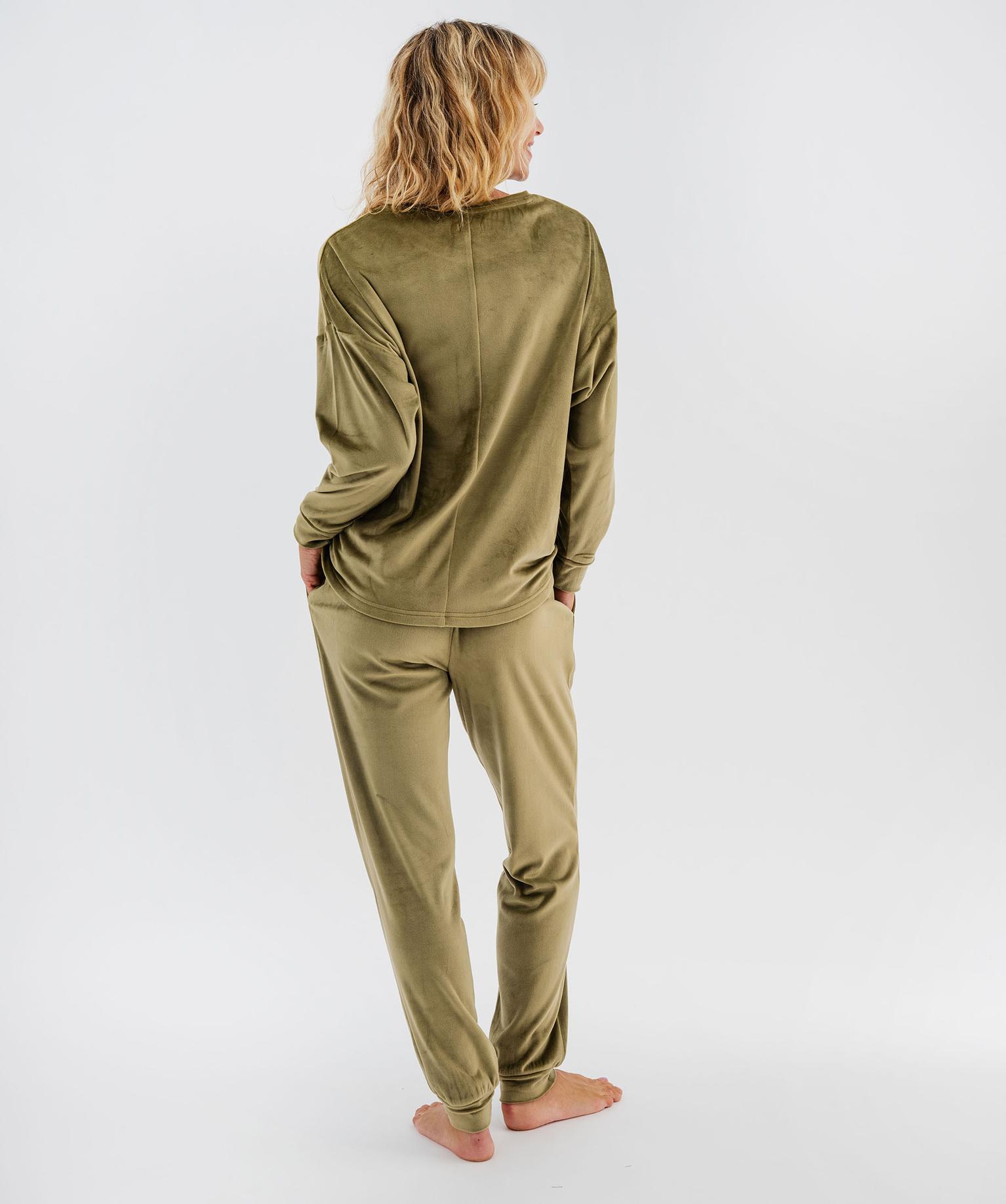 Vous allez adorer le confort de ce pyjama en velours extensible offrant une douceur exceptionnelle et une grande liberté de mouvement. Un pyjama femme composé d’un haut ample avec col rond et épaules tombantes, doté d’une poche poitrine, et d’un pantalon large avec ceinture élastique, muni de poches latérales dissimulées dans les coutures. Cet ensemble homewear, idéal pour des nuits confortables, se porte également le jour lors des moments de détente. Finitions biais aux poignets et aux chevilles.