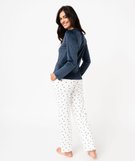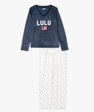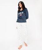 Craquez pour la douceur de ce pyjama en velours LuluCastagnette. Un pyjama femme composé d’un haut à manches longues et d’un pantalon ample au coloris contrastant avec ceinture élastique ajustable par cordon coulissant. Sur ce pyjama confortable on retrouve les codes de la célèbre marque à l’ourson et des finitions de qualité : joli col V souligné par un biais, broderies sur le haut, imprimé tendance sur le pantalon. Un ensemble de nuit que vous pourrez porter également comme tenue homewear pour des soirées au top du confort.
