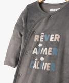 Pour des nuits confortables et bien au chaud, adoptez ce pyjama bébé à la forme dors-bien et en velours douillet ! Son ouverture intégrale devant par boutons-pression facilite l'enfilage et le change. Sur l'avant, le pyjama est décoré du message "Rêver, Aimer, Câliner".