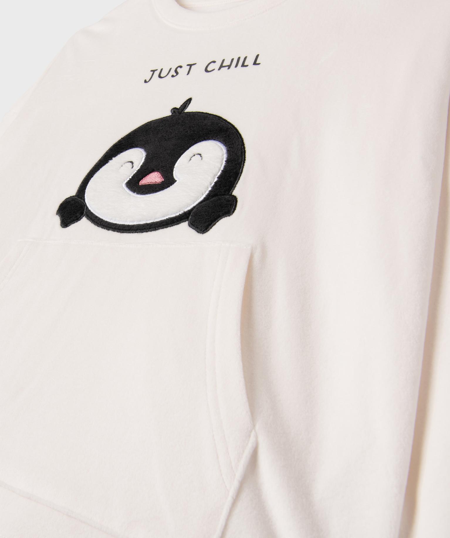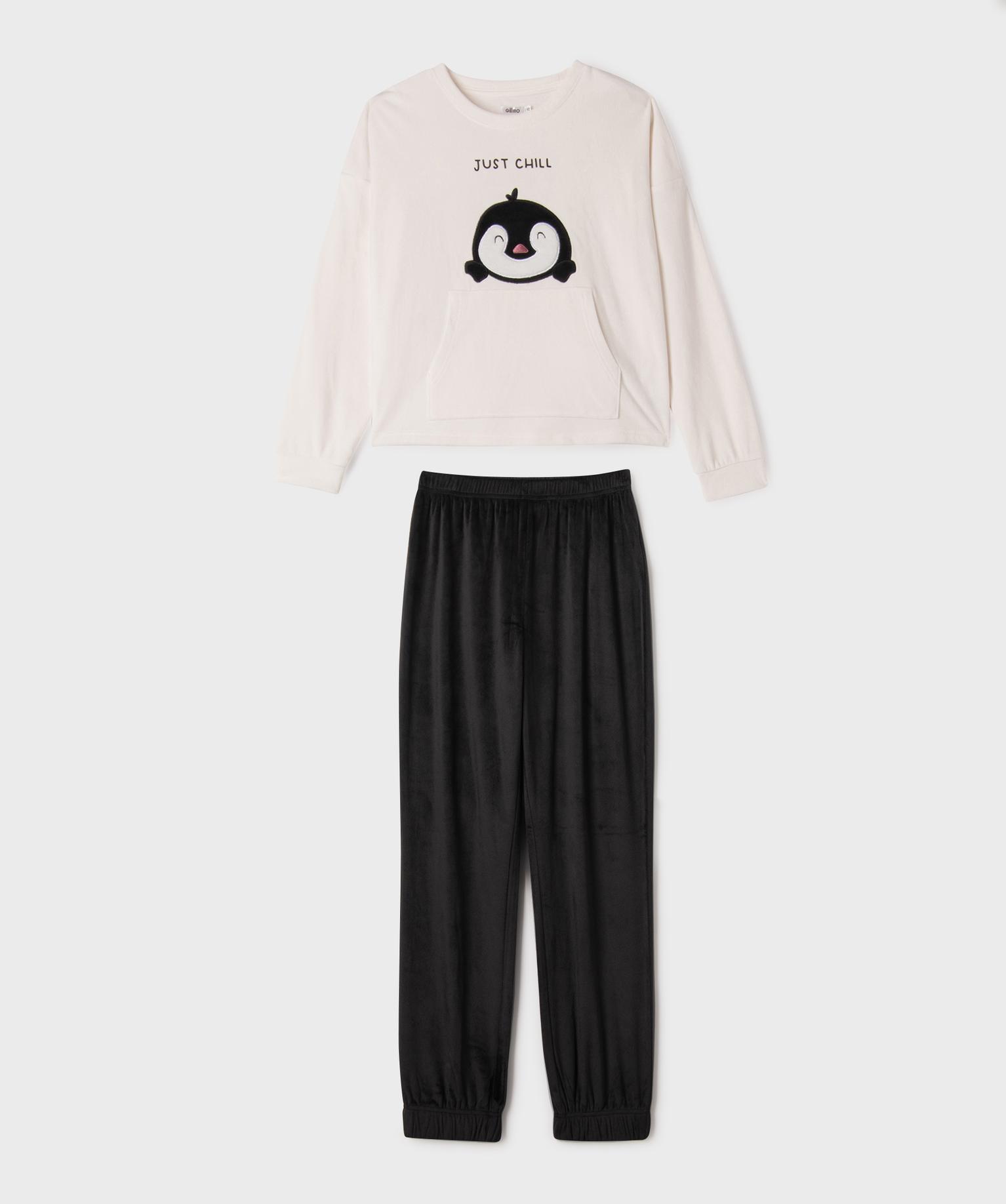 Ce pyjama fille en velours fin ultra doux offre confort et douceur pour des nuits paisibles. Le haut à manches longues présente un col rond, un imprimé pingouin ludique sur le devant et une poche kangourou aussi stylée que pratique. Le bas uni et contrastant complète l’ensemble avec une taille élastiquée pour un enfilage facile et un maintien parfait. Il est également doté de bas de jambes élastiqués. Un pyjama à la fois cosy et adorable.