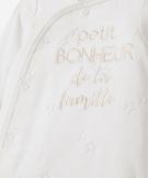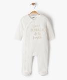 Indispensable du dressing de bébé, le pyjama dors-bien en velours s’affiche dans une version parsemée d’étoiles. Il est également orné du message « Petit bonheur de la famille » brodé sur le buste, un message qui convient aux bébés filles comme aux bébés garçons. Ce pyjama bébé permet un habillage facile des tout-petits grâce à sa fermeture sur l’avant par une rangée de boutons pression allant du col jusqu’au pied. Finitions biais.