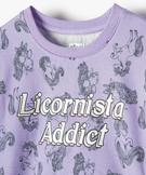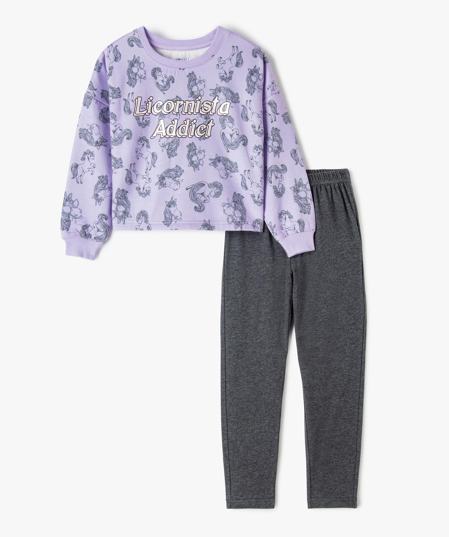 Voici un pyjama fille qui possède de nombreux atouts pour plaire aux petites fashionistas. Il affiche un look totalement tendance avec son haut sweat ample et court effet oversize, avec épaules tombantes. Un haut de pyjama entièrement molletonné avec finitions bord-côte au col et aux poignets. Il est parsemé de petites licornes et décoré d’une inscription. Il accompagne un pantalon de pyjama en jersey fin avec taille élastiquée.
