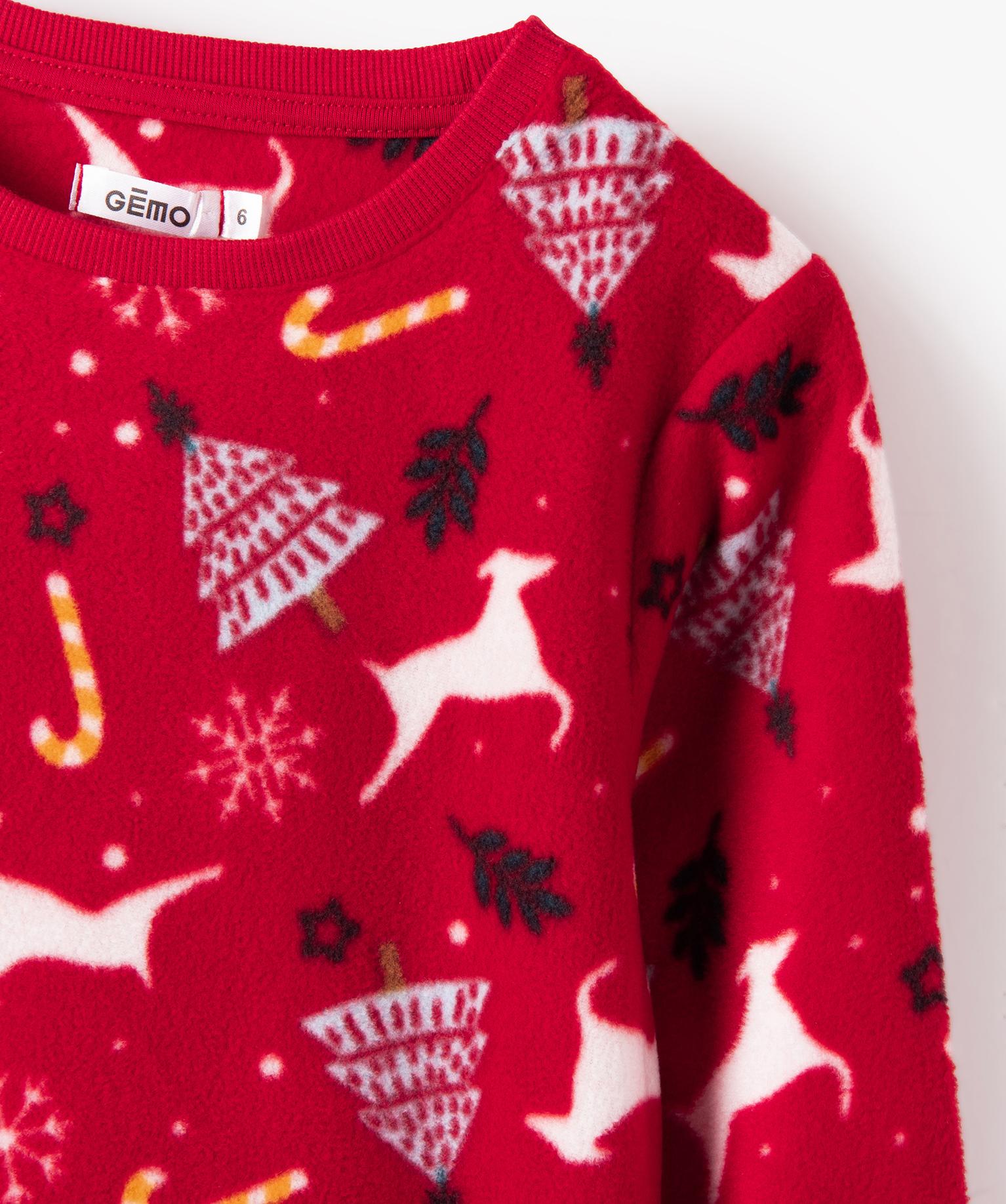 Motifs inspiration Noël à foison, confection en polaire chaude, coupe confortable et enfilage facile, ce pyjama garçon est idéal pour une journée cocooning en hiver ou pour déballer les cadeaux au matin de Noël ! Haut et bas de pyjama coordonnés avec motif all over. Finition bord-côte uni au col.
