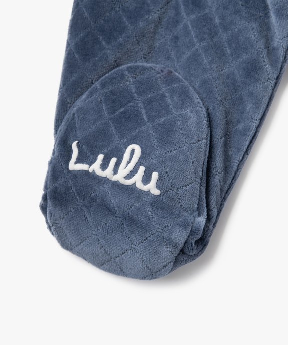Craquez pour ce beau pyjama LuluCastagnette d’inspiration marine composé d’une brassière et d’un pantalon. Un pyjama bébé garçon en velours tout doux agrémenté de rayures sur le haut et d’un délicat motif matelassé sur le bas. Le haut brassière possède une fermeture croisée sur l’avant avec boutons pression. Il est orné d’un petit noeud et d’un ourson brodé, signature de la marque. Le pantalon à pieds possède une ceinture élastique qui reste confortable en toutes circonstances. Sous les pieds, une inscription et un ourson antidérapant permettent à bébé de marcher sans glisser. Un pyjama 2 pièces plein de charme et de douceur !