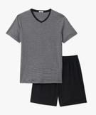 Offrez-vous un maximum de douceur et de confort pour passer des nuits paisibles. Ce pyjashort pour homme 100% coton vous accompagnera toute l’année, il offre une chaleur idéale pour bien dormir. Il se compose d’un tee-shirt à manches courtes et col V à fines rayures et d’un short uni avec taille élastiquée. Un pyjama bicolore à porter été comme hiver pour dormir ou comme tenue d’intérieur. Finition biais unie sur le col.