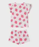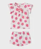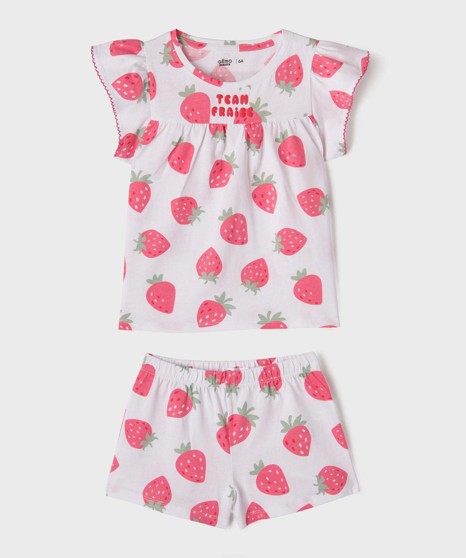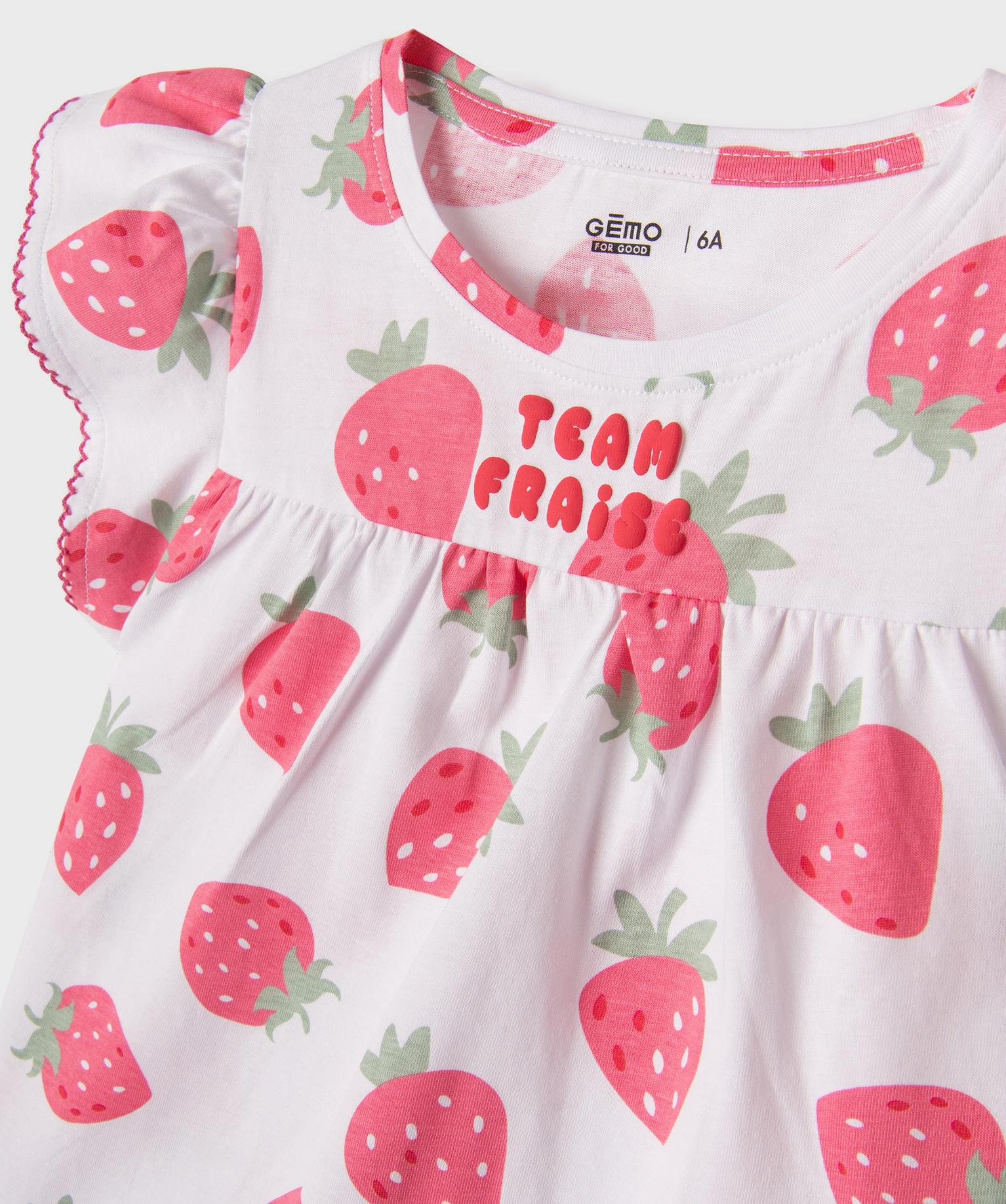 Impossible de résister à ce pyjashort fille en jersey de coton, aussi confortable qu’adorable. Il se compose d’un short à coupe droite, doté d’une taille élastiquée pour un maximum de confort, et d’un haut plein de charme. Les petits mancherons froncés aux épaules, la finition croquet au bas des manches et la découpe froncée à la poitrine apportent une touche délicate et romantique. Son col rond bien dégagé et son motif fraises à croquer en font un pyjama aussi joli pour dormir que parfait en tenue homewear.