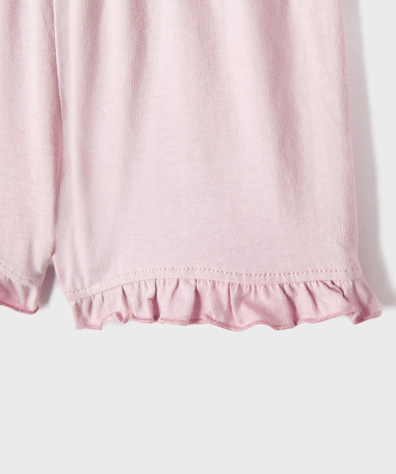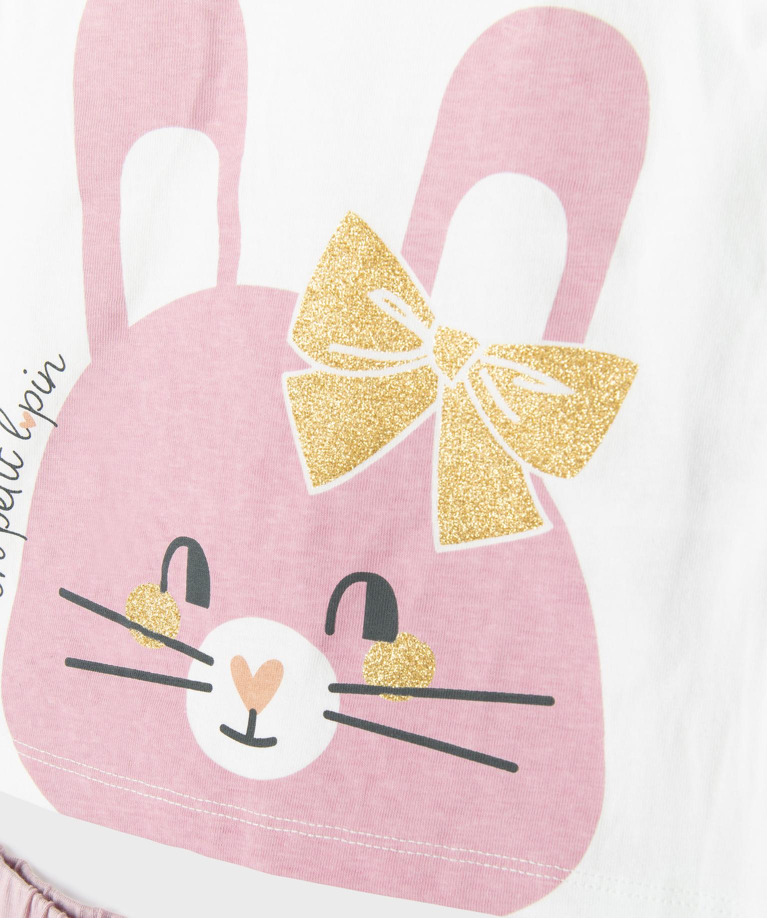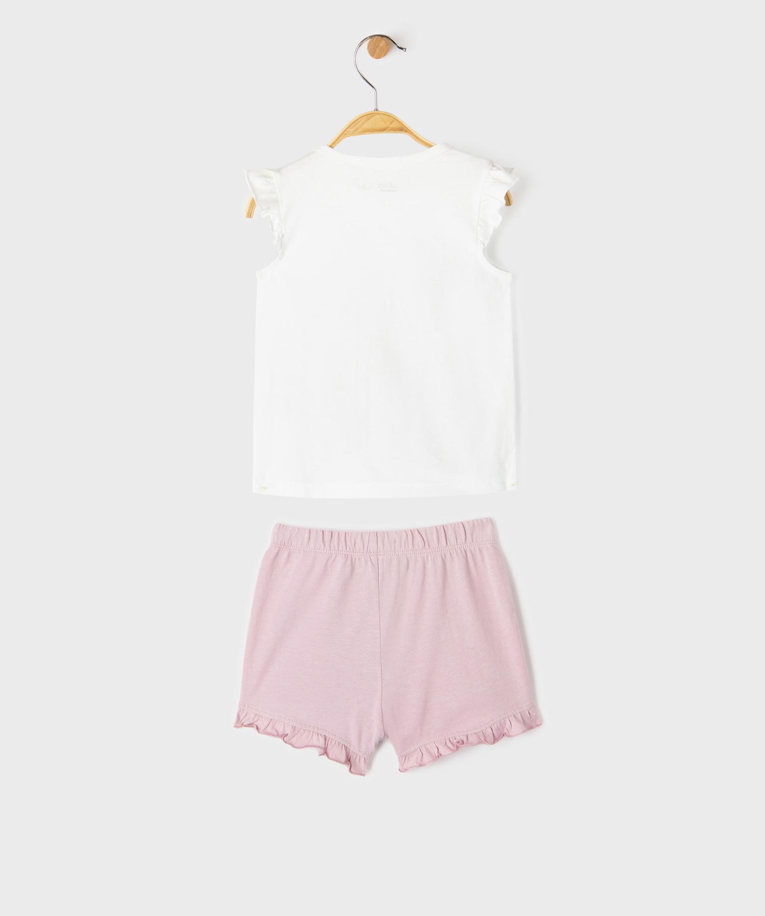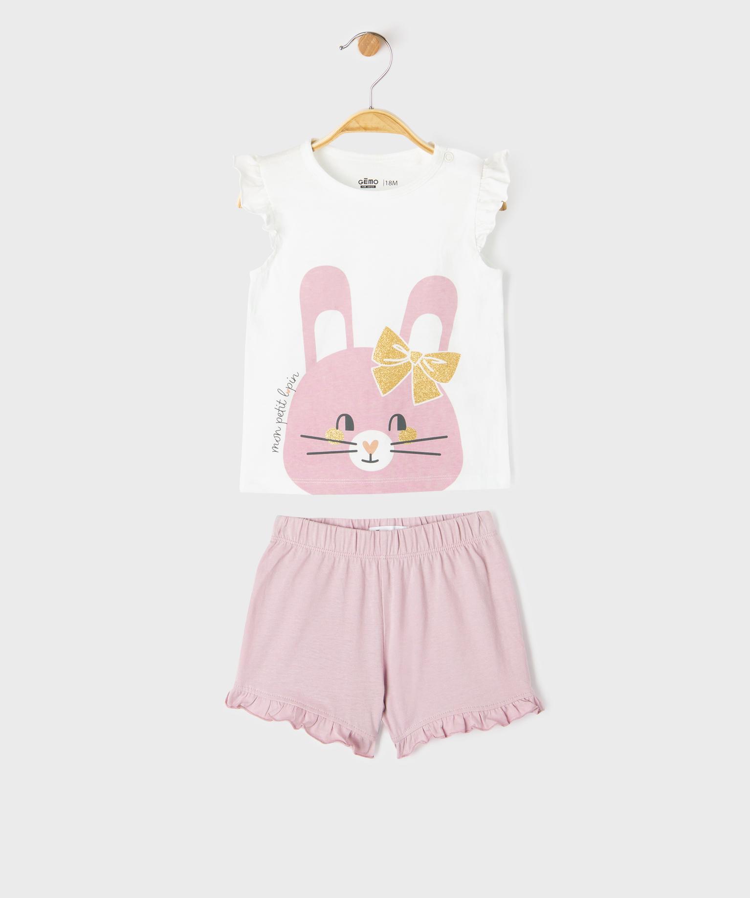 Ce pyjashort bébé fille respire la tendresse et la fantaisie. En jersey de coton doux, il séduit par son motif lapin rehaussé de détails pailletés dorés. Le haut sans manches, orné de volants aux épaules, s’enfile facilement grâce au bouton-pression sur l'épaule. Le short uni, contrastant, complète joliment l’ensemble avec sa taille élastiquée et ses volants en bas de jambe. Un pyjama court à la fois confortable et adorable.