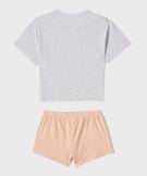 Pensé pour les ados, ce pyjashort fille Kuromi – Hello Kitty & Friends adopte un look résolument tendance. Le bas est un short ample à taille élastiquée, avec cordon factice pour le style. Le haut, un crop top loose à manches courtes tombantes et col rond en bord côte, affiche un grand imprimé Kuromi sur l’avant. L’association d’un short uni pastel et d’un haut chiné crée un ensemble mix and match qui se porte aussi bien comme pyjama que comme tenue détente.