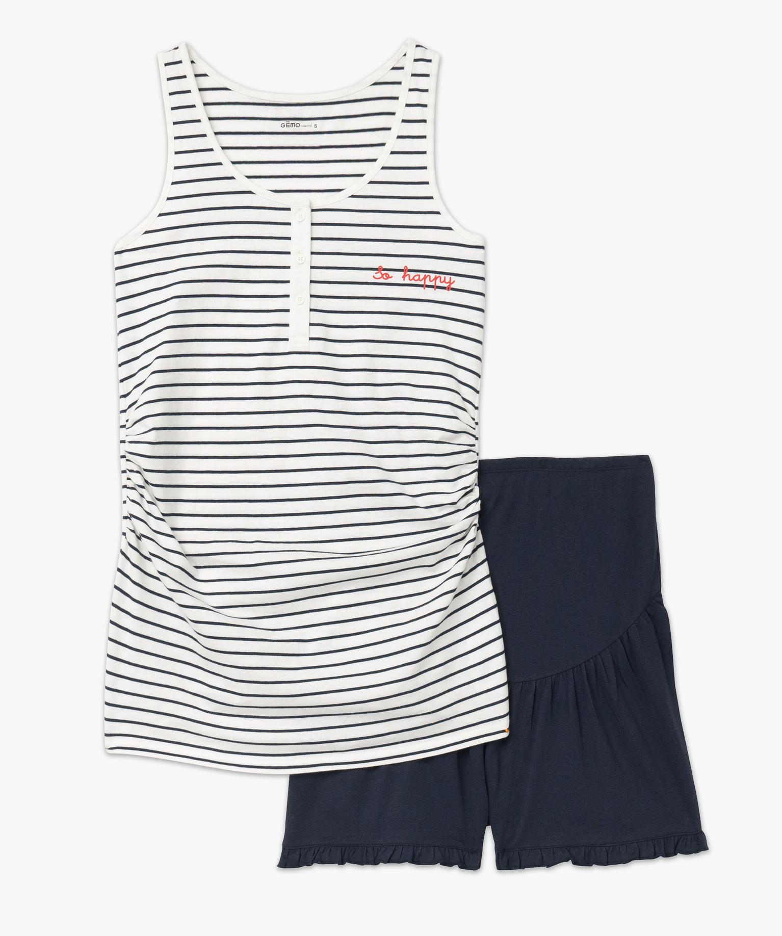 Ce pyjashort vous accompagnera au pays des rêves tout au long de votre grossesse et même après la naissance de bébé. Ce pyjashort de maternité se compose d’un débardeur à rayures agrémenté d’une inscription sur la poitrine, et d’un short uni. Le débardeur de nuit arbore un large col rond qui s’ouvre à l’aide de 3 boutons pour faciliter l’allaitement. Des fronces de chaque côté permettent de suivre l’évolution de votre ventre au fil des mois. Le short de pyjama offre confort et style glamour avec son large bandeau, ses fronces et ses petits volants dans le bas. Un ensemble de nuit à porter sans modération, également comme tenue d’intérieur lors des moments de détente.