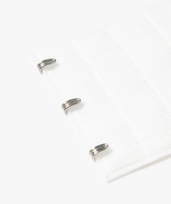 Offrez une nouvelle vie à un soutien-gorge trop petit facilement et sans coutures ! Adoptez la rallonge pour attache de soutien-gorge ! Cette rallonge de 55 mm dotée de 3 x 3 agrafes en métal argenté rajoute jusqu'à 4 cm au tour de buste. Elle s'accroche aux extrémités de votre soutien-gorge très simplement pour vous offrir confort et aisance supplémentaire. Envers côté peau en matière douce. Espacement de 18 mm entre chaque crochet.