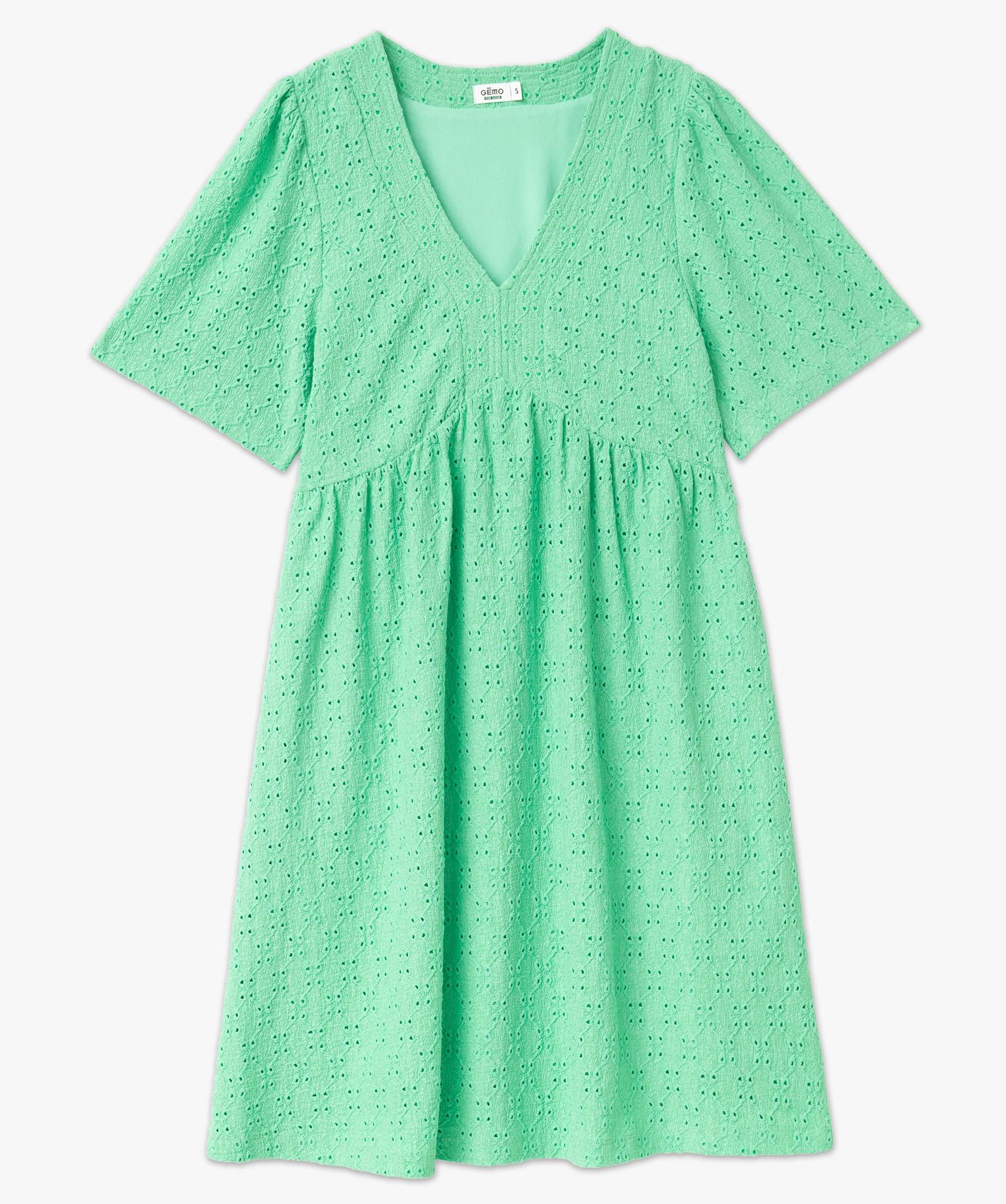 Cette robe femme affiche une allure franchement romantique avec ses motifs ajourés façon broderie anglaise et ses manches courtes froncées sur les épaules. Elle arbore un décolleté en V bordé par un large biais et une taille empire qui souligne élégamment la poitrine. La partie jupe, froncée sous la taille, est évasée pour offrir toujours plus de confort. Une robe manches courtes dans la tendance éco-responsable, confectionnée à partir de polyester recyclé. Elle se porte avec une paire de tennis en toile comme avec des sandales à talon.