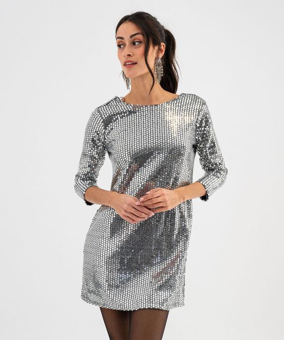 Ambiance disco assurée grâce à cette robe à sequins qui réfléchit les rayons lumineux comme aucune autre ! Une robe courte pour femme dotée d’un col rond et d’un décolleté en V dans le dos qui peut également se porter devant. Elle possède des manches 3/4 et est entièrement doublée de maille jersey pour plus de confort. Une robe de soirée à porter aussi bien avec une paire d’escarpins à talon pour un look sophistiqué, qu’avec des boots crantés pour un style glam'rock.