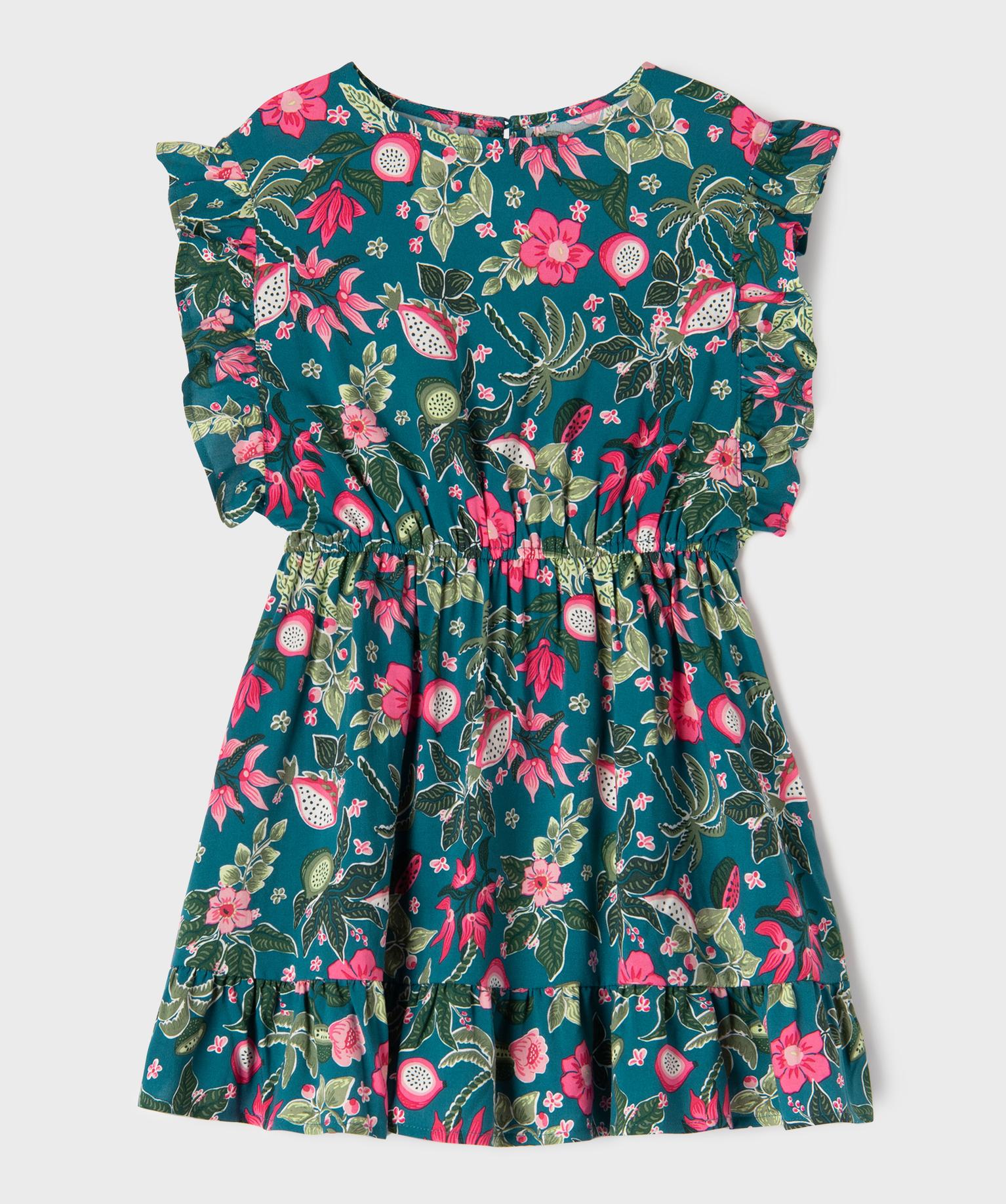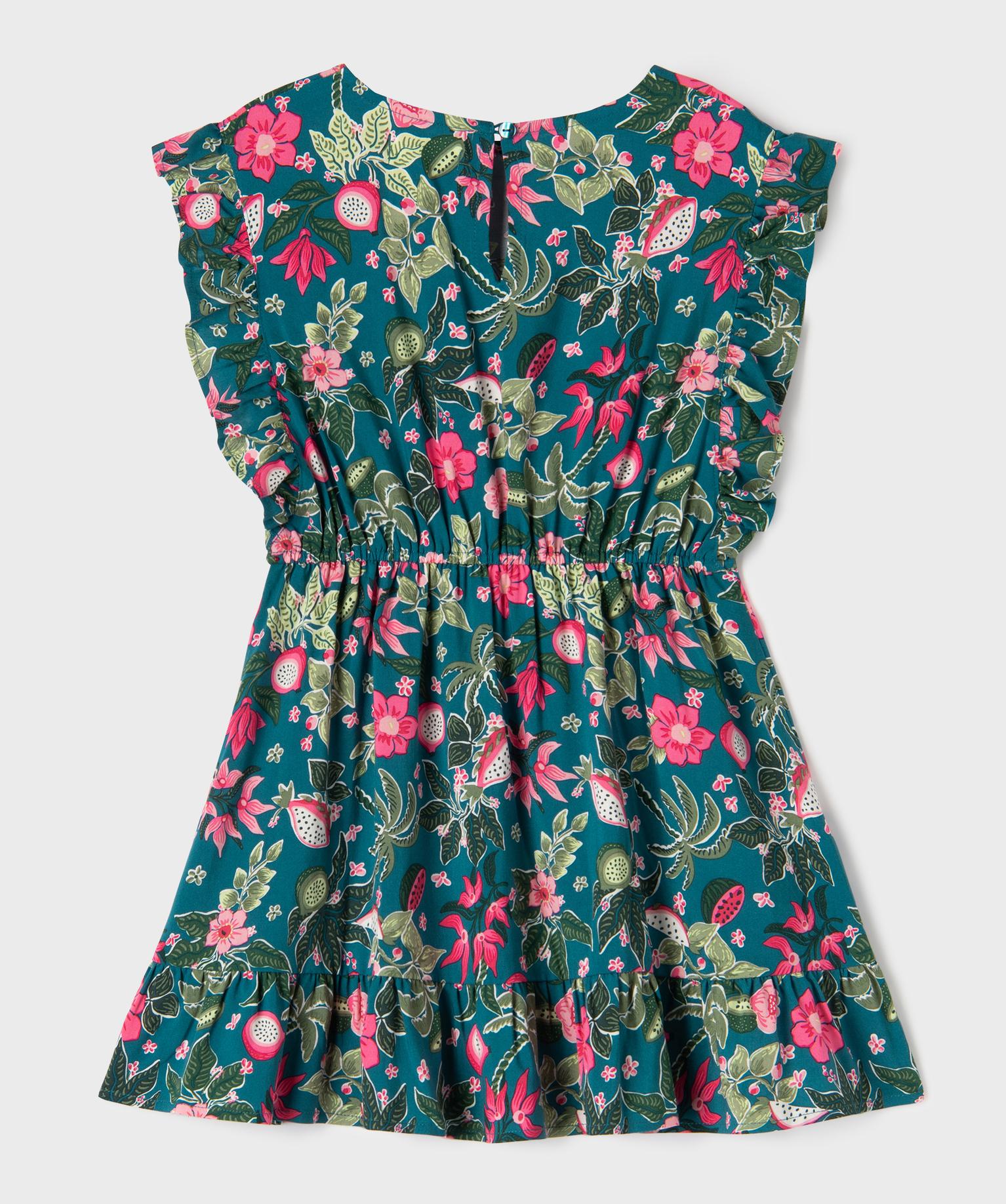 Ambiance 100% estivale pour cette sublime robe pour fille. Une robe en viscose fluide ornée de plantes tropicales, de fleurs et de fruits gourmands qui apportera un véritable rayon de soleil dans le vestiaire des jeunes fashionistas. Cette robe d'été se distingue par ses empiècements volantés aux emmanchures et dans le bas. Elle est dotée d’une taille élastique assurant un grand confort et se ferme à l’aide d’un bouton dans le haut du dos. Elle se porte au quotidien avec des baskets, comme pour les occasions festives avec des jolies sandales.