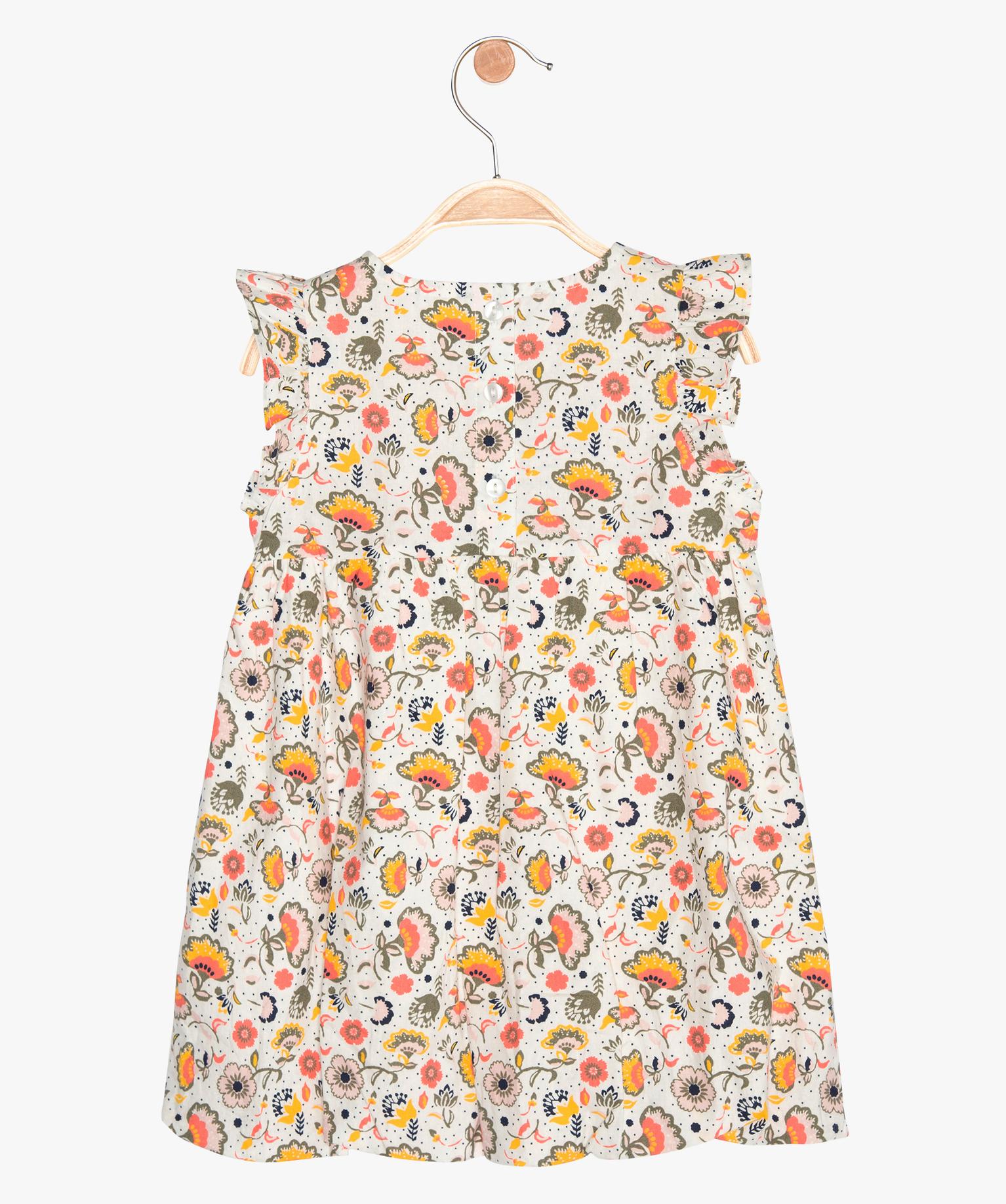 Une jolie robe fleurie parfaite pour l’été ! Confectionnée dans une toile de coton légère, elle offre beaucoup de confort aux petites filles. Cette robe bébé fille possède des petits volants au niveau des emmanchures. La partie jupe est froncée à la taille et resserrée par un élastique dans le bas pour un effet bouffant. Cette robe fleurie se ferme par trois boutons nacrés dans le dos pour faciliter l’habillage. Une robe d’été à porter au quotidien ou comme robe de cérémonie bébé.