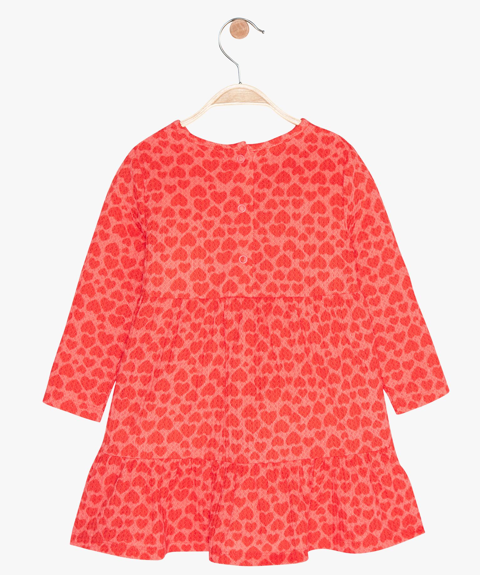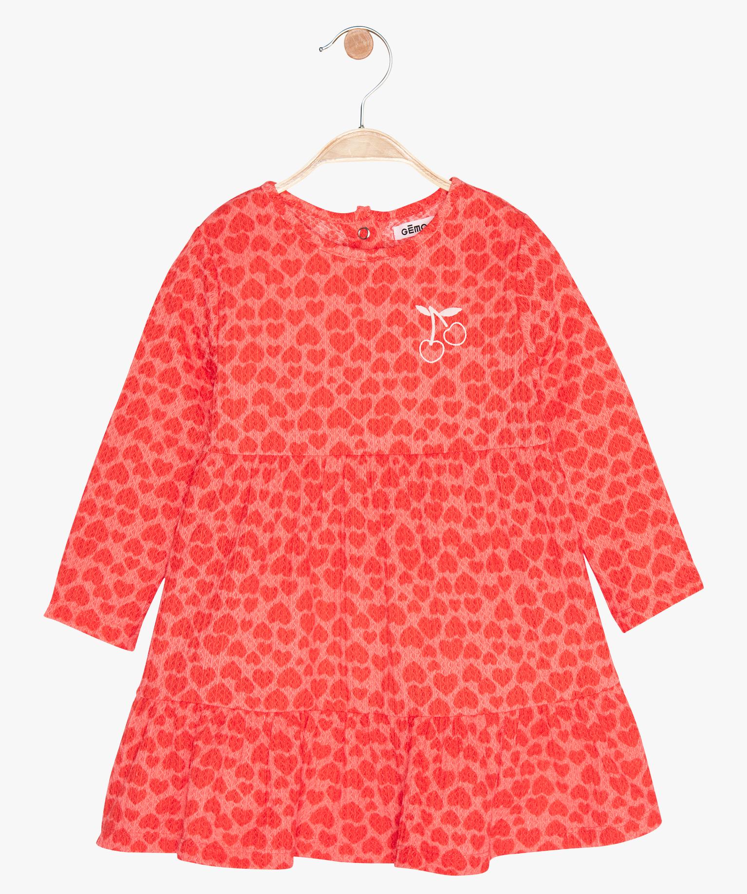 Cette robe bébé fille va vite devenir la favorite de votre enfant : avec sa coupe bohème, ample et confortable, elle s'enfile en toutes occasions. Une robe à manches longues et col rond, idéalement adaptée à la mi-saison. Cette pièce très girly et joyeuse est entièrement parsemée d'un motif cœur, mis en valeur par une matière gaufrée hyper agréable. À porter avec des tennis en toile blanche et une veste en jean pour un look tendance ! Finition biais au col. Haut du dos pressionné pour un enfilage facile. Motif cerises au niveau du cœur. Fronces.