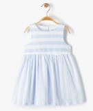 Dès le plus jeune âge, les filles aiment être élégantes et porter de belles robes. Cette robe bébé fille accompagnera les petites princesses lors de tous les évènements festifs de l’été. Une jolie robe sans manches qui se joue dans des teintes pastel pour assurer aux enfants un look romantique. Elle est agrémentée d’un ruban à la taille et d’un petit nœud fantaisie. La partie jupe est froncée et son volume est accentué par un jupon en coton avec volant en tulle. Une robe de cérémonie bébé élégante et confortable. Fermeture boutons dans le haut du dos. Col rond.