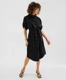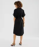 Cette robe chemise vous promet une allure impeccable, offrant un parfait équilibre entre sobriété et féminité. Cette robe femme est dotée d’un col chemise, de deux poches à rabat sur la poitrine et se ferme par une rangée de boutons aspect écaille. Ses manches courtes possèdent un revers cousu et peuvent se remonter à l’aide d’une patte à fixer sur un bouton au niveau de l’épaule. Elle est munie d’une ceinture à nouer ton sur ton. Fluide et confortable, cette robe longue vous assure une silhouette élancée. Elle se porte aussi bien avec des escarpins qu’avec des bottines.